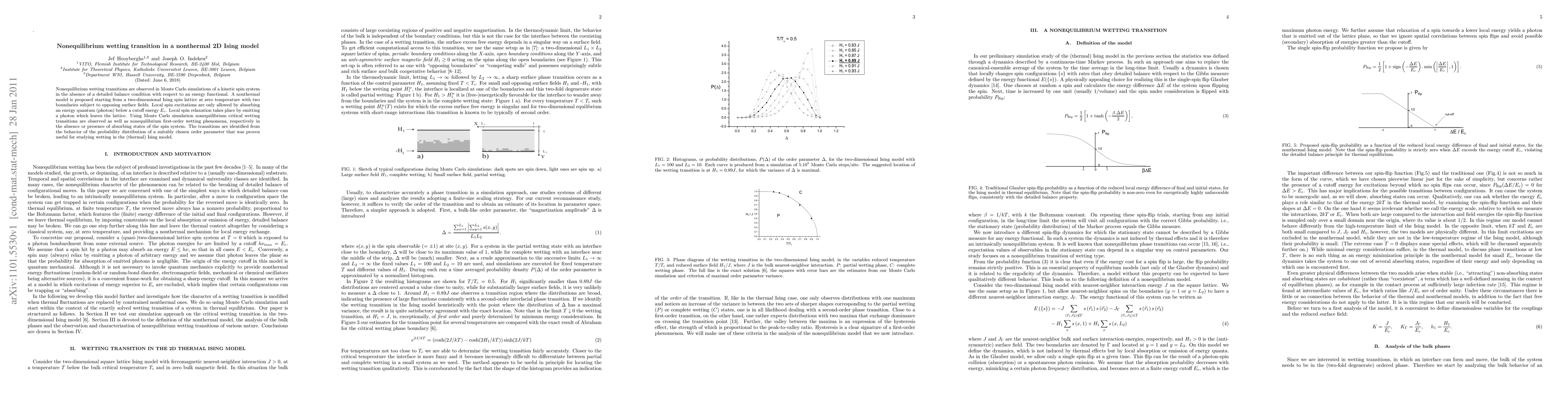 This paper investigates nonequilibrium wetting transitions in a nonthermal 2D Ising model using Monte Carlo simulations. The model allows local spin excitations via photon absorption and relaxation through photon emission, leading to critical and first-order wetting phenomena depending on the presence of absorbing spin states.