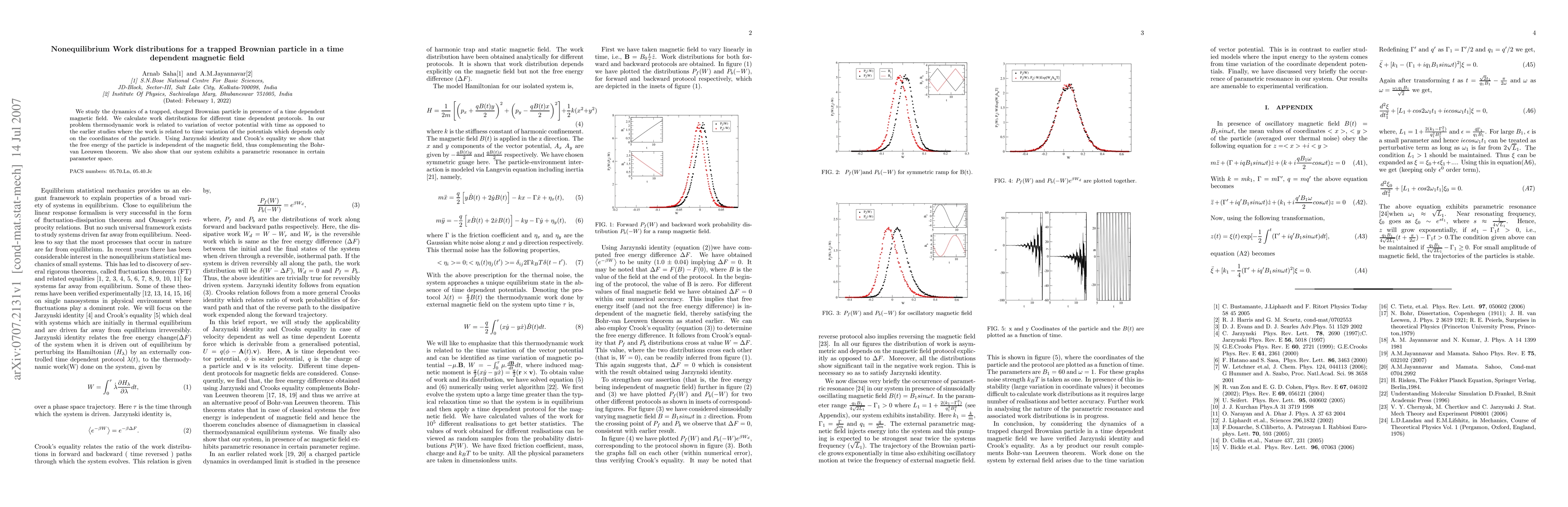 We study the dynamics of a trapped, charged Brownian particle in presence of a time dependent magnetic field. We calculate work distributions for different time dependent protocols. In our problem thermodynamic work is related to variation of vector potential with time as opposed to the earlier studies where the work is related to time variation of the potentials which depends only on the coordinates of the particle. Using Jarzynski identity and Crook's equality we show that the free energy of the particle is independent of the magnetic field, thus complementing the Bohr-van Leeuwen theorem. We also show that our system exhibits a parametric resonance in certain parameter space.