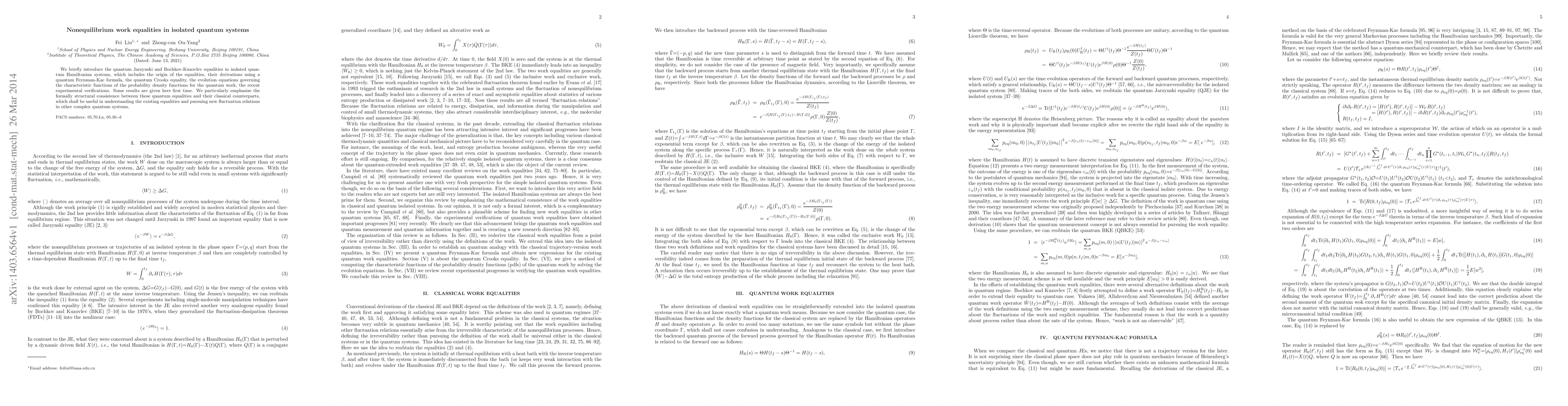 This paper explores nonequilibrium work equalities in isolated quantum systems, deriving quantum versions of the Jarzynski and Bochkov-Kuzovlev equalities using a quantum Feynman-Kac formula and highlighting their structural consistency with classical counterparts. It also reports first-time results and discusses recent experimental verifications.