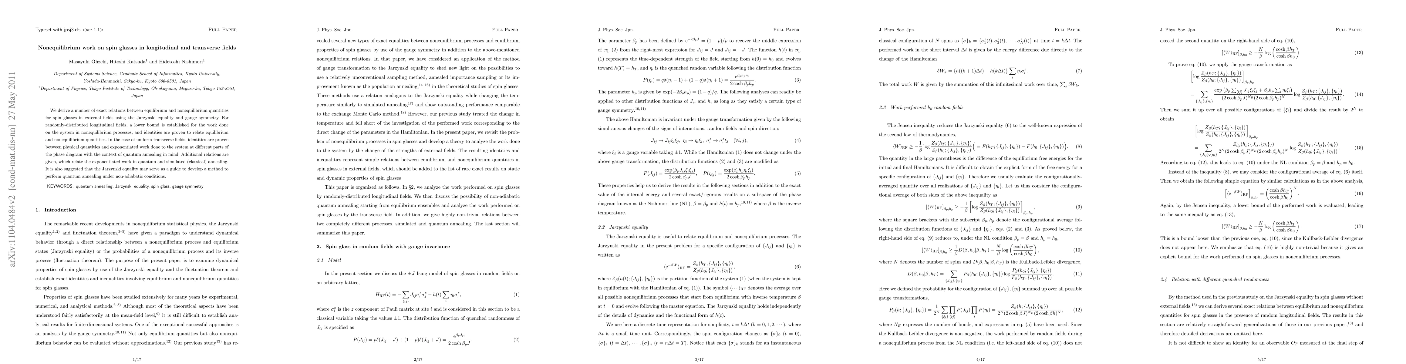 This paper derives exact relations between equilibrium and nonequilibrium quantities for spin glasses under external fields, establishing a lower bound for work done in nonequilibrium processes and proving identities for both longitudinal and transverse fields, with implications for quantum annealing and non-adiabatic conditions.