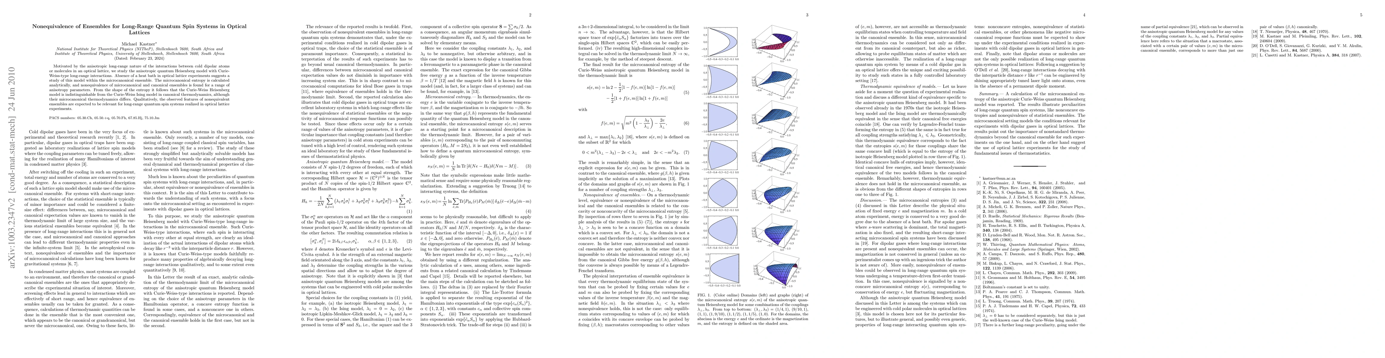 Motivated by the anisotropic long-range nature of the interactions between cold dipolar atoms or molecules in an optical lattice, we study the anisotropic quantum Heisenberg model with Curie-Weiss-type long-range interactions. Absence of a heat bath in optical lattice experiments suggests a study of this model within the microcanonical ensemble. The microcanonical entropy is calculated analytically, and nonequivalence of microcanonical and canonical ensembles is found for a range of anisotropy parameters. From the shape of the entropy it follows that the Curie-Weiss Heisenberg model is indistinguishable from the Curie-Weiss Ising model in canonical thermodynamics, although their microcanonical thermodynamics differs. Qualitatively, the observed features of nonequivalent ensembles are expected to be relevant for long-range quantum spin systems realized in optical lattice experiments.