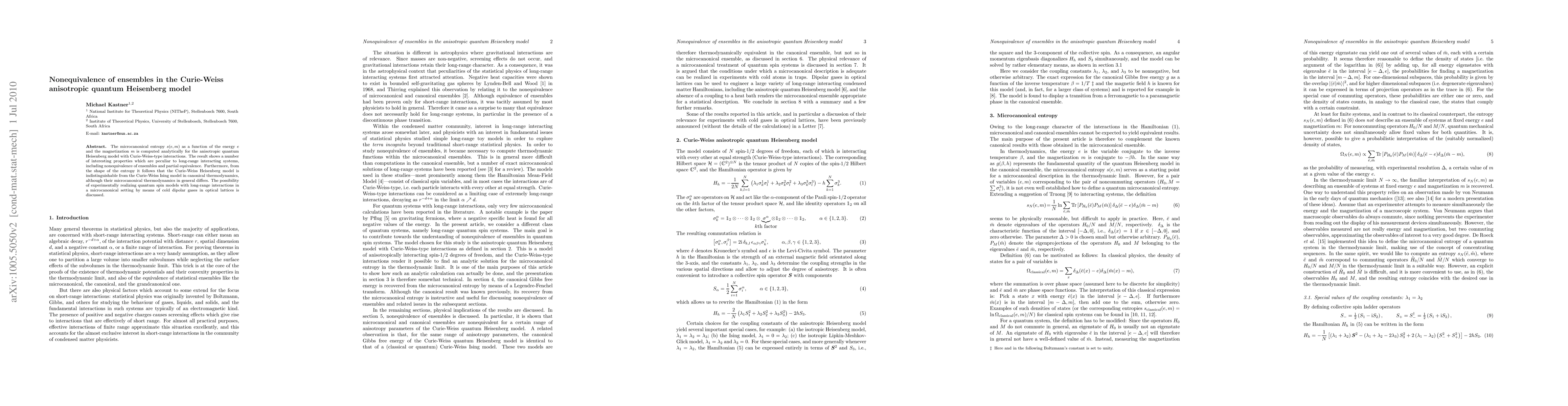 This paper analytically computes the microcanonical entropy for the anisotropic quantum Heisenberg model with Curie-Weiss interactions, revealing nonequivalence and partial equivalence of ensembles in long-range systems. It also discusses the potential for cold dipolar gases in optical lattices to realize such quantum spin models experimentally.