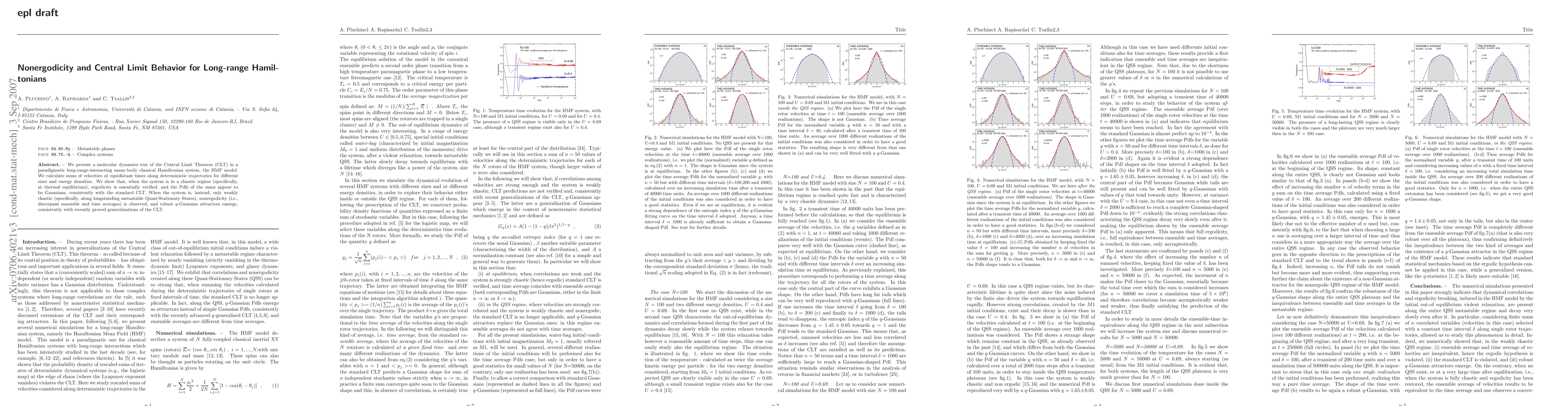 This research investigates the Central Limit Theorem (CLT) in long-range Hamiltonian systems, finding ergodicity and Gaussian distributions in chaotic regimes, while nonergodicity and $q$-Gaussian attractors emerge in weakly chaotic, metastable states.