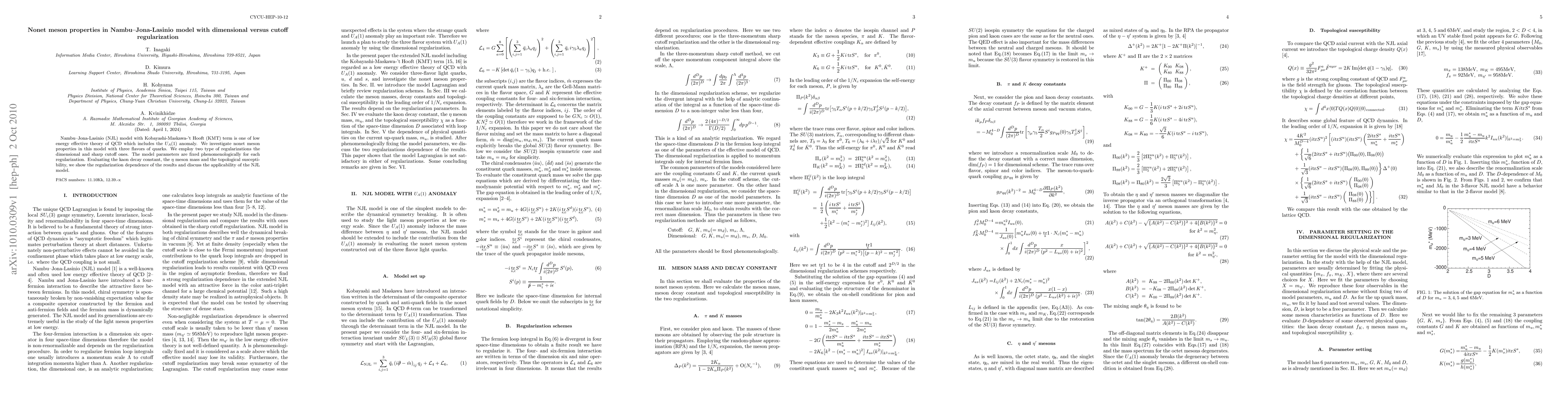 This paper investigates nonet meson properties in the Nambu--Jona-Lasinio model with two regularization methods—dimensional and cutoff—to study their impact on model parameters. The results reveal regularization dependence in kaon decay constant, $\eta$ meson mass, and topological susceptibility, highlighting the NJL model's applicability.