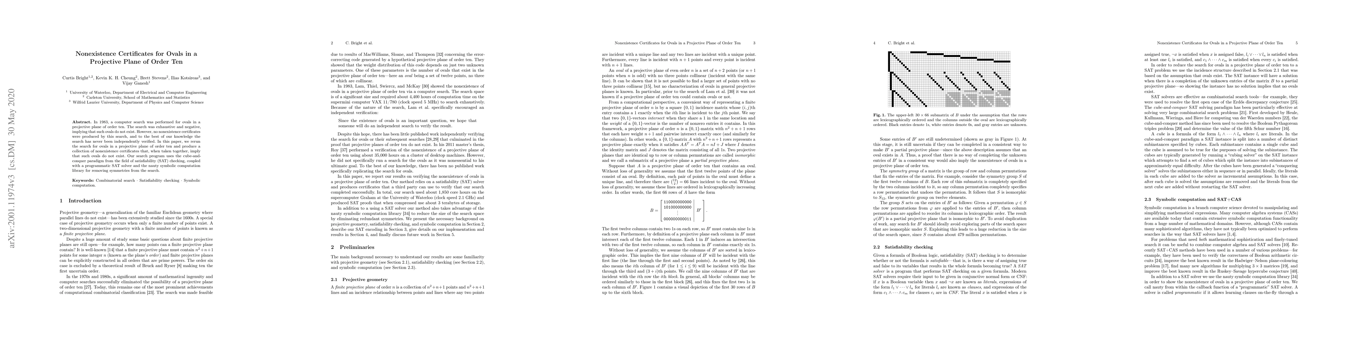 This paper reruns a 1983 exhaustive search for ovals in a projective plane of order ten, producing nonexistence certificates that confirm the absence of such ovals. It employs the cube-and-conquer SAT checking method and the nauty library to systematically verify the original negative result.