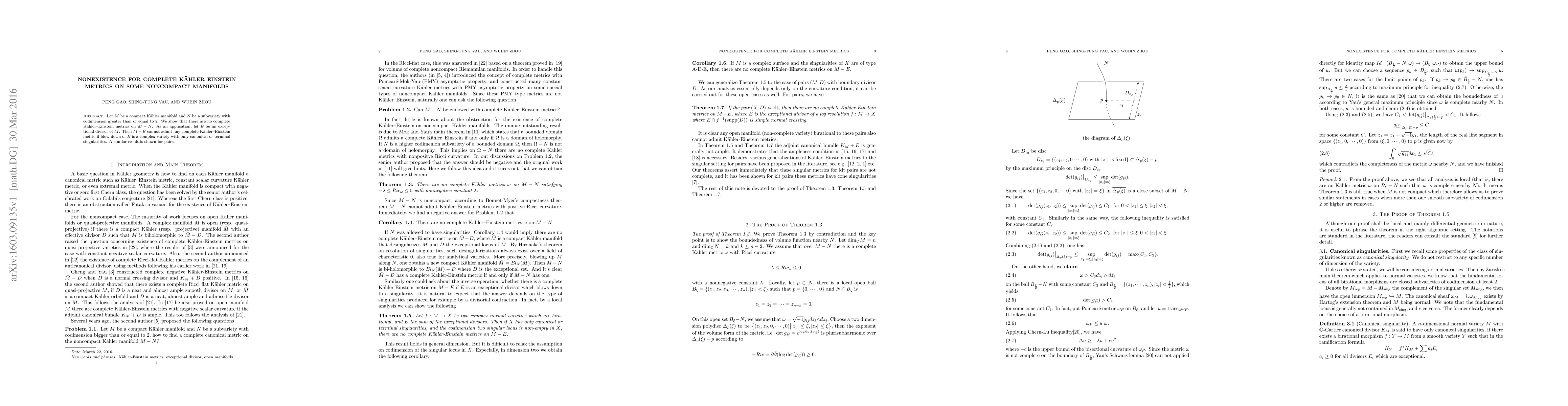 This paper demonstrates the nonexistence of complete Kähler-Einstein metrics on certain noncompact Kähler manifolds, specifically those with subvarieties of codimension greater than or equal to 2. It also applies this result to manifolds with exceptional divisors, showing they cannot admit such metrics under specific conditions.