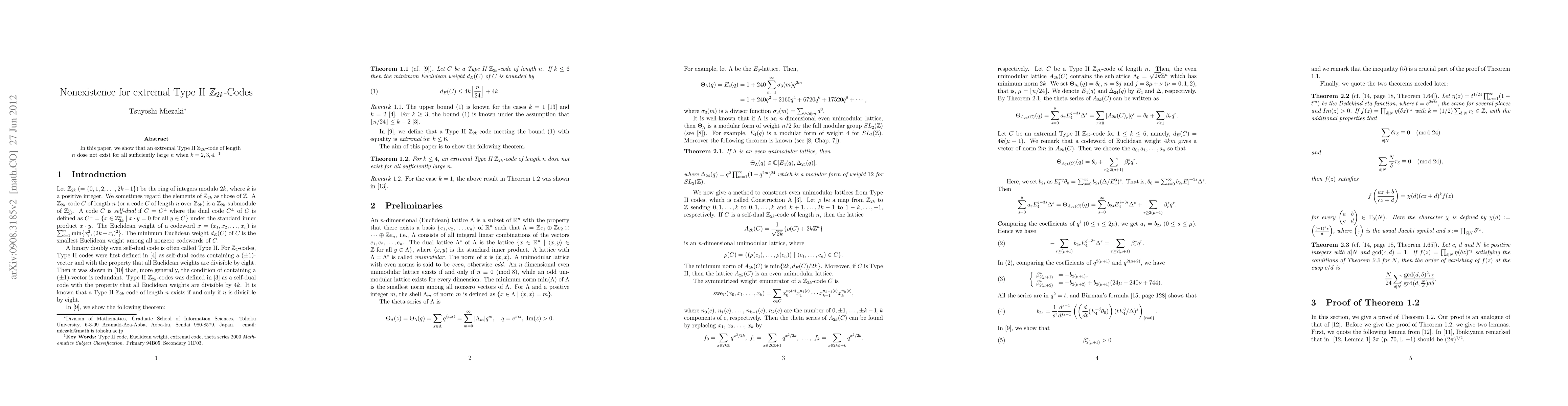 Summary: This paper demonstrates that extremal Type II $\ZZ_{2k}$-codes of length $n$ do not exist for sufficiently large $n$ when $k$ is in the set $\{2,3,4,5,6\}$. The result highlights the nonexistence of such codes for specific values of $k$.