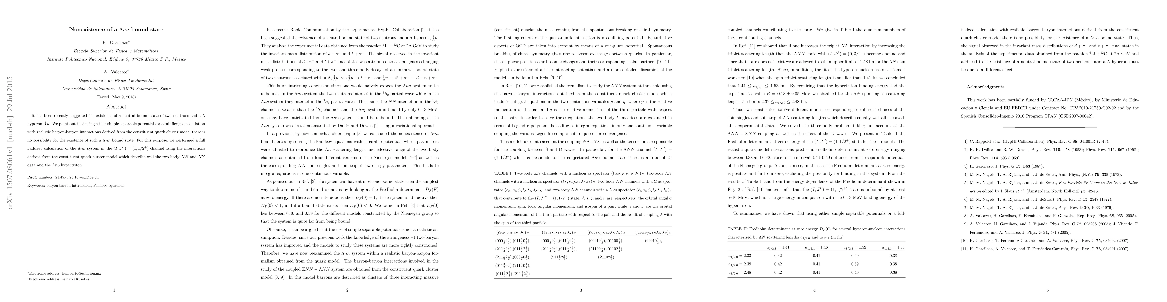 It has been recently suggested the existence of a neutral bound state of two neutrons and a $\Lambda$ hyperon, $^3_\Lambda n$. We point out that using either simple separable potentials or a full-fledged calculation with realistic baryon-baryon interactions derived from the constituent quark cluster model there is no possibility for the existence of such a $\Lambda nn$ bound state. For this purpose, we performed a full Faddeev calculation of the $\Lambda nn$ system in the $(I,J^P)=(1,1/2^+)$ channel using the interactions derived from the constituent quark cluster model which describe well the two-body $NN$ and $NY$ data and the $\Lambda np$ hypertriton.