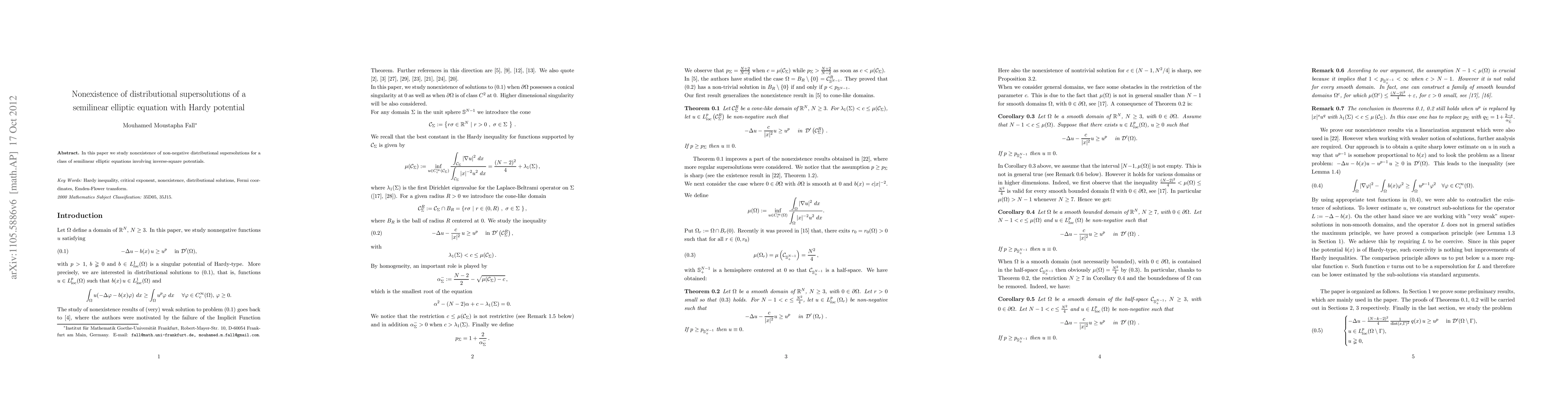 Summary: This paper investigates the absence of non-negative distributional supersolutions for semilinear elliptic equations featuring inverse-square potentials. The findings demonstrate that such solutions do not exist for the specified class of equations.