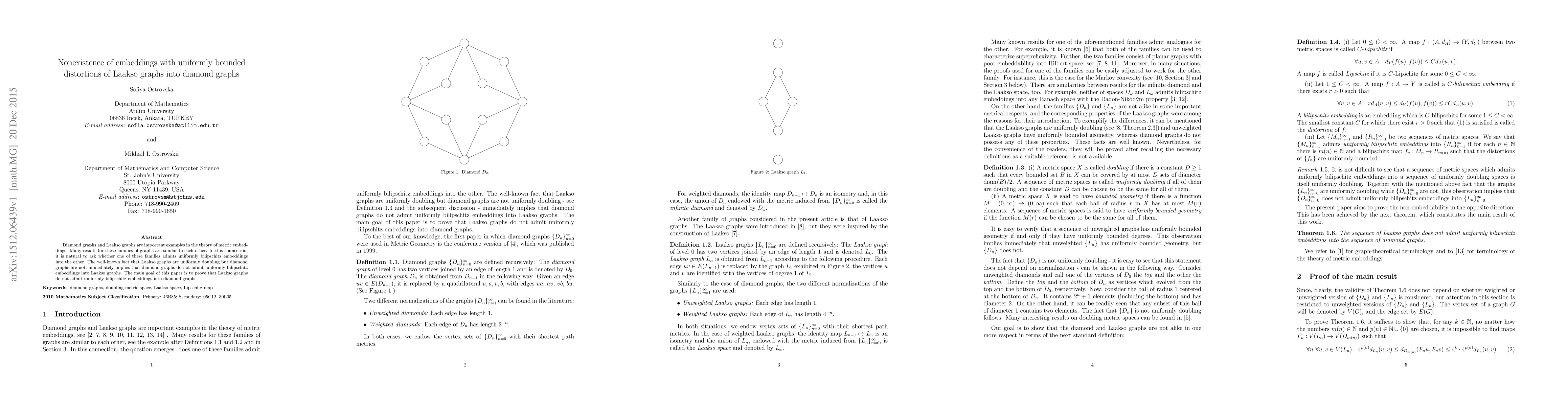 This paper proves that Laakso graphs cannot be embedded into diamond graphs with uniformly bounded distortions. The key distinction lies in the uniform doubling property of Laakso graphs, contrasting with the non-uniform doubling nature of diamond graphs.