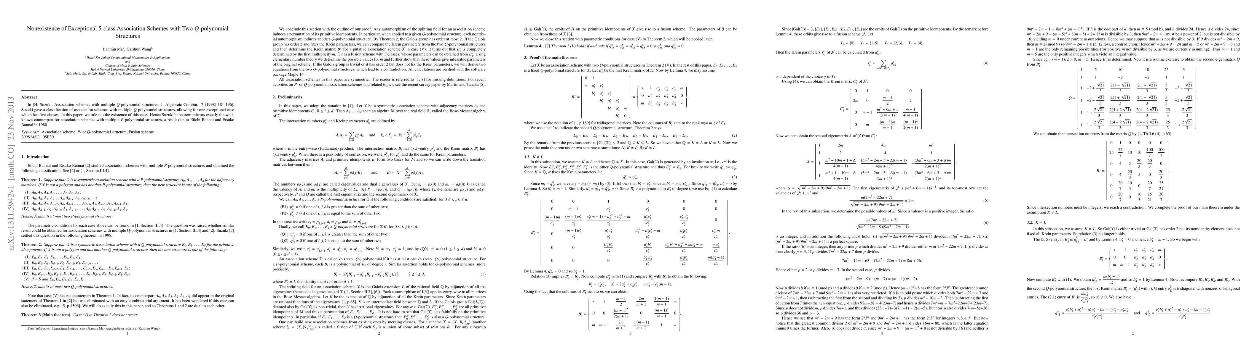 This paper disproves the existence of an exceptional 5-class association scheme with two $Q$-polynomial structures, thus confirming the classification by Suzuki and aligning with the earlier result by Bannai and Bannai for $P$-polynomial structures.