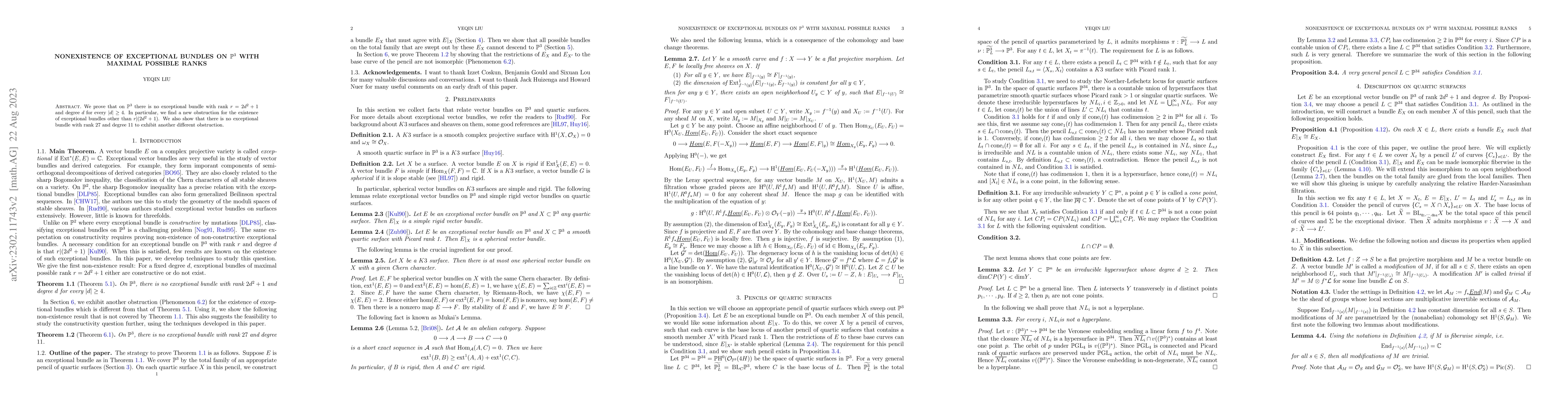 Summary: The paper proves the nonexistence of exceptional vector bundles on $\mathbb{P}^{3}$ with rank $r=2d^{2}+1$ and degree $d$ for $|d|\geq 4$, introducing new obstructions beyond $r|(2d^{2}+1)$, and specifically demonstrates the nonexistence of such bundles with rank $27$ and degree $11$.