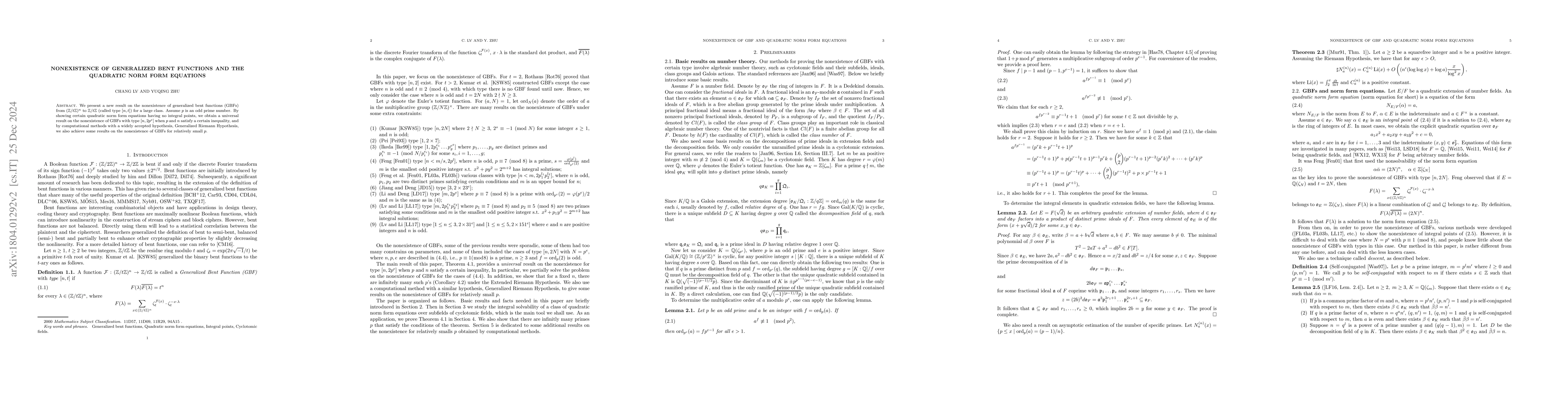 The paper proves the nonexistence of generalized bent functions with certain types for large values of n, using quadratic norm form equations and computational methods under the generalized Riemann hypothesis.
