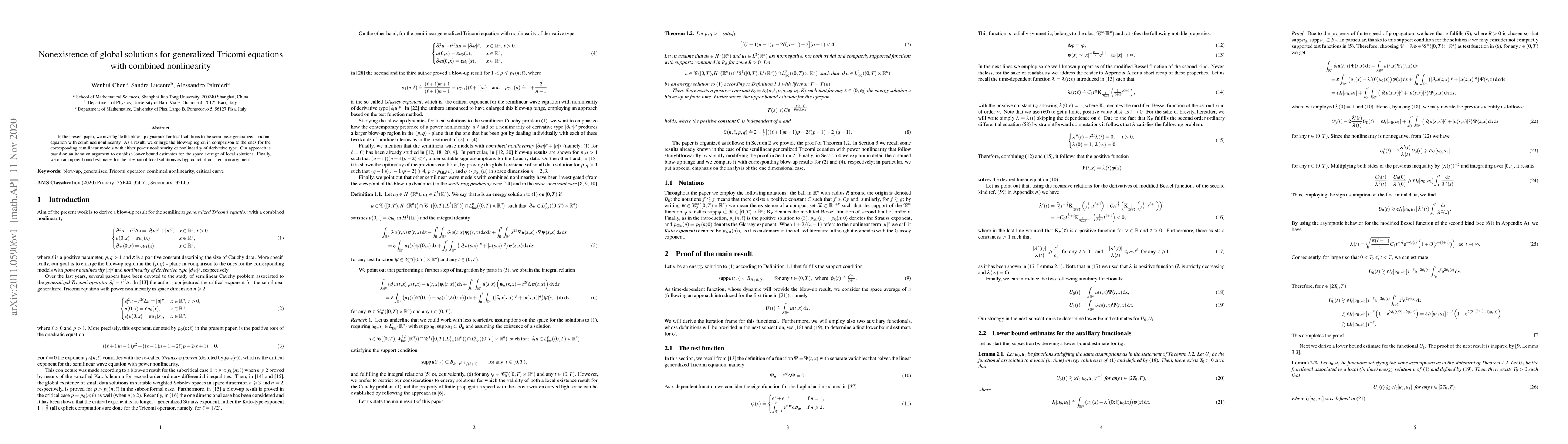 This paper examines the blow-up dynamics of local solutions to the semilinear generalized Tricomi equation with combined nonlinearity, demonstrating an enlarged blow-up region compared to models with simpler nonlinearities. The authors use an iteration argument to establish lower bounds for the space average of local solutions and derive upper bounds for the lifespan of these solutions.