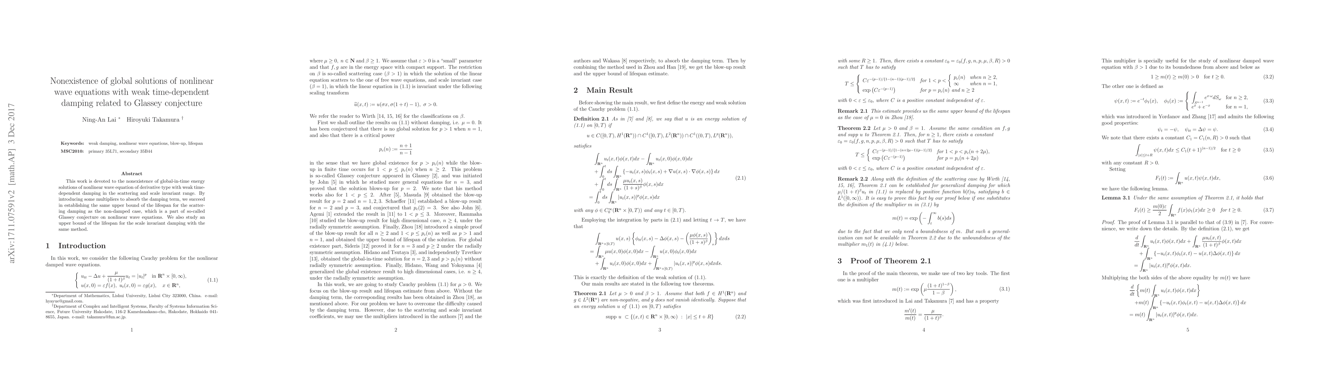 This paper demonstrates the nonexistence of global-in-time energy solutions for nonlinear wave equations with weak time-dependent damping, proving an upper bound for the lifespan that matches the non-damped case, thus supporting part of Glassey's conjecture. An upper bound for scale invariant damping is also established using similar techniques.