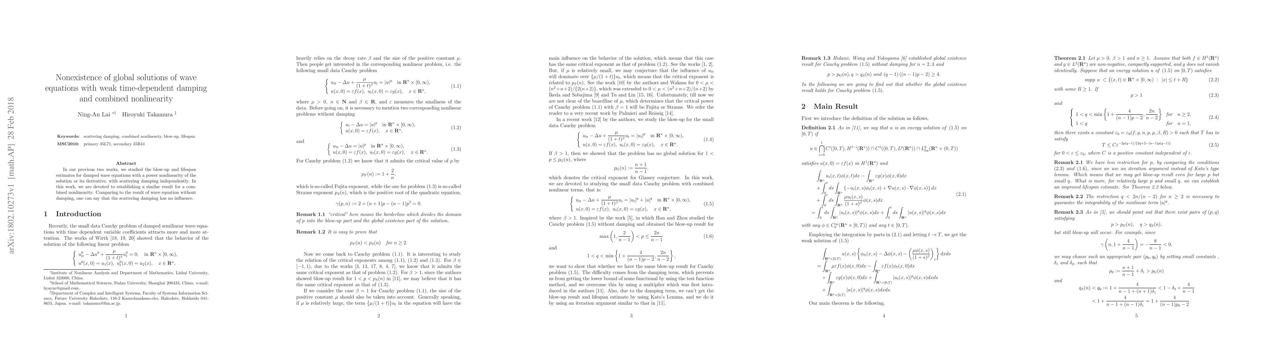 Summary: This paper investigates the nonexistence of global solutions for wave equations featuring weak time-dependent damping and combined nonlinearities, extending previous findings on blow-up and lifespan estimates for similar equations with independent scattering damping. The study concludes that scattering damping does not affect the results compared to undamped wave equations.