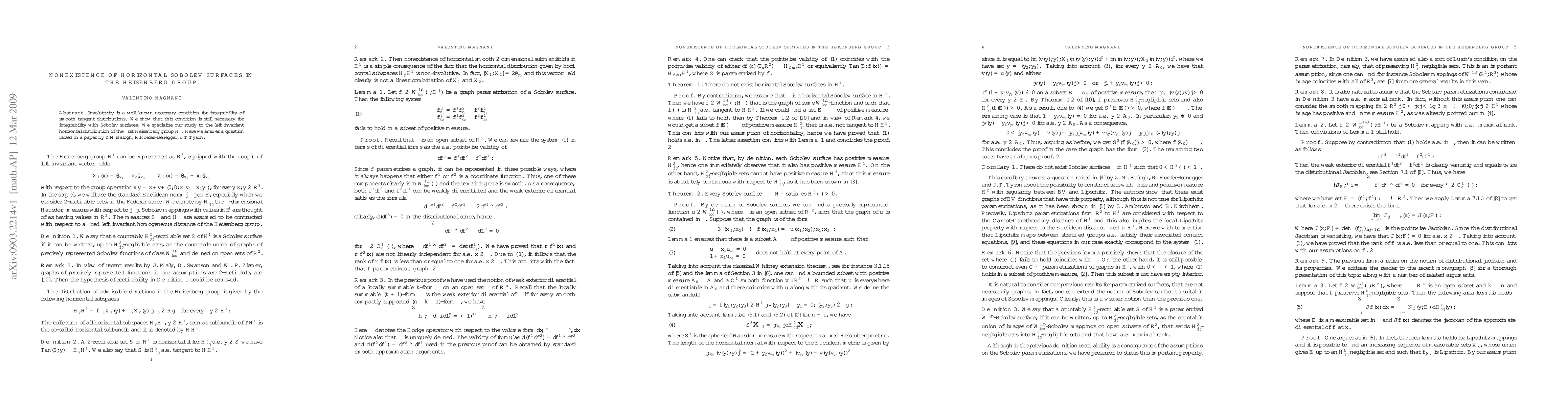 Involutivity is a well known necessary condition for integrability of smooth tangent distributions. We show that this condition is still necessary for integrability with Sobolev surfaces. We specialize our study to the left invariant horizontal distribution of the first Heisenberg group $\H^1$. Here we answer a question raised in a paper by Z.M.Balogh, R.Hoefer-Isenegger, J.T.Tyson.