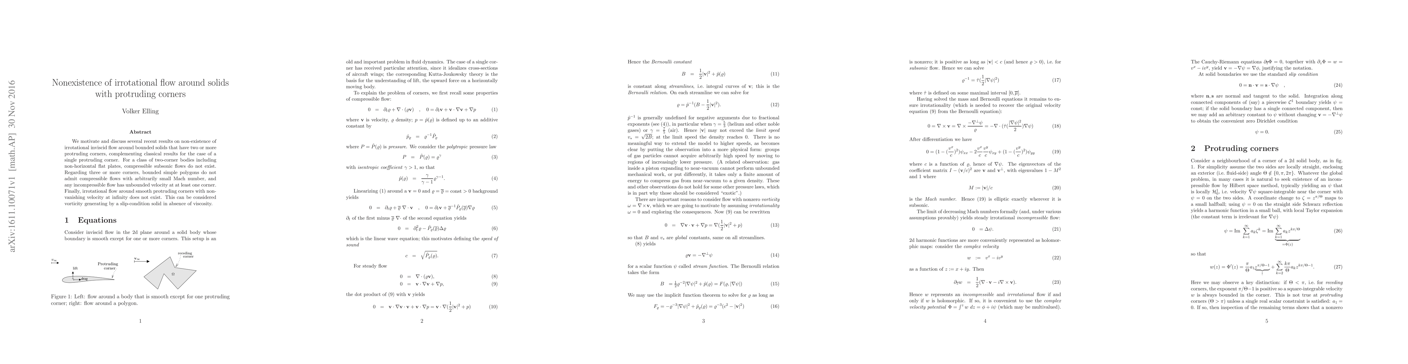 We motivate and discuss several recent results on non-existence of irrotational inviscid flow around bounded solids that have two or more protruding corners, complementing classical results for the case of a single protruding corner. For a class of two-corner bodies including non-horizontal flat plates, compressible subsonic flows do not exist. Regarding three or more corners, bounded simple polygons do not admit compressible flows with arbitrarily small Mach number, and any incompressible flow has unbounded velocity at at least one corner. Finally, irrotational flow around smooth protruding corners with non-vanishing velocity at infinity does not exist. This can be considered vorticity generating by a slip-condition solid in absence of viscosity.