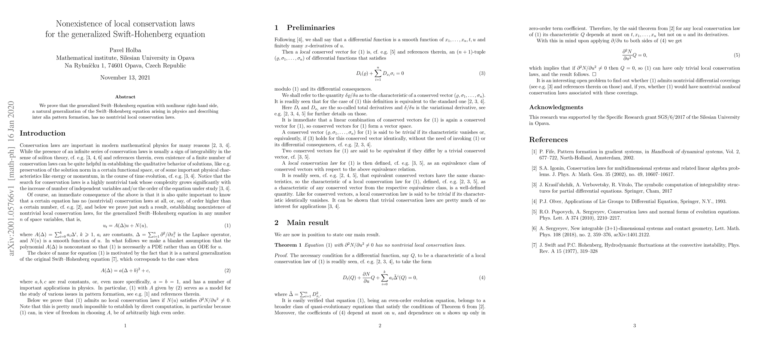 Summary: This paper demonstrates that the generalized Swift-Hohenberg equation, which extends the original equation to describe pattern formation, lacks nontrivial local conservation laws. The findings challenge the existence of such conservation laws in this context.