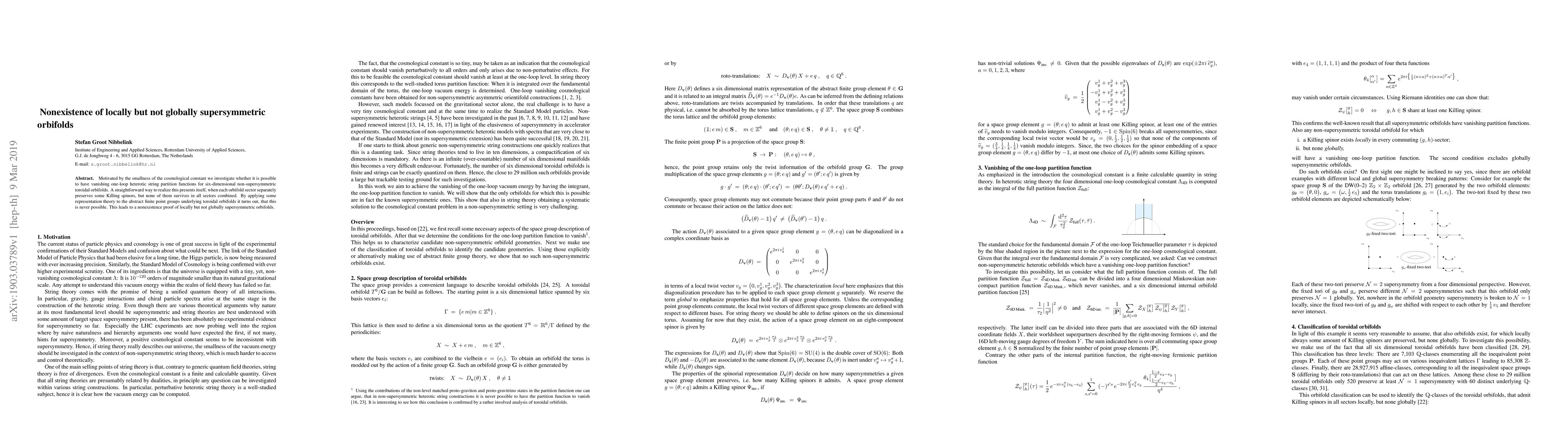 Motivated by the smallness of the cosmological constant we investigate whether it is possible to have vanishing one-loop heterotic string partition functions for six-dimensional non-supersymmetric toroidal orbifolds. A straightforward way to realize this presents itself, when each orbifold sector separately preserves some Killing spinors, but none of them survives in all sectors combined. By applying some representation theory to the abstract finite point groups underlying toroidal orbifolds it turns out, that this is never possible. This leads to a nonexistence proof of locally but not globally supersymmetric orbifolds.