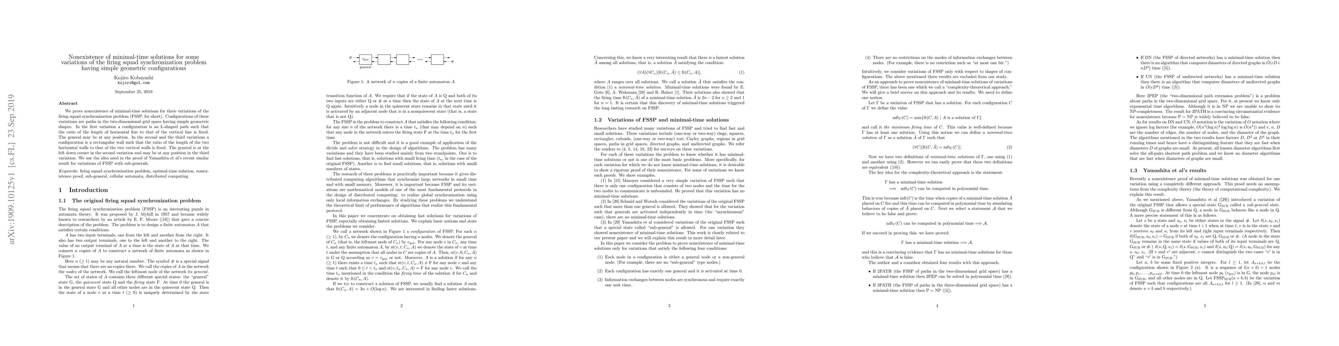 We prove nonexistence of minimal-time solutions for three variations of the firing squad synchronization problem (FSSP, for short). Configurations of these variations are paths in the two-dimensional grid space having simple geometric shapes. In the first variation a configuration is an L-shaped path such that the ratio of the length of horizontal line to that of the vertical line is fixed. The general may be at any position. In the second and the third variations a configuration is a rectangular wall such that the ratio of the length of the two horizontal walls to that of the two vertical walls is fixed. The general is at the left down corner in the second variation and may be at any position in the third variation. We use the idea used in the proof of Yamashita et al's recent similar result for variations of FSSP with sub-generals.