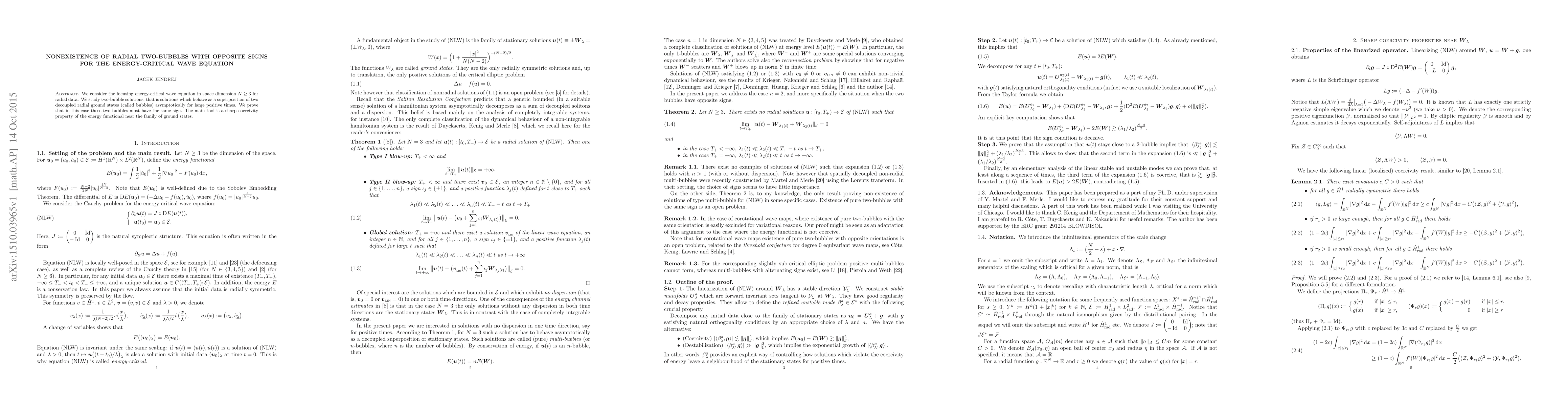 Summary: This paper proves that for radial solutions of the focusing energy-critical wave equation in dimensions $N \geq 3$, two-bubble solutions cannot exist with opposite signs; the key method involves demonstrating a sharp coercivity property of the energy functional near ground states.