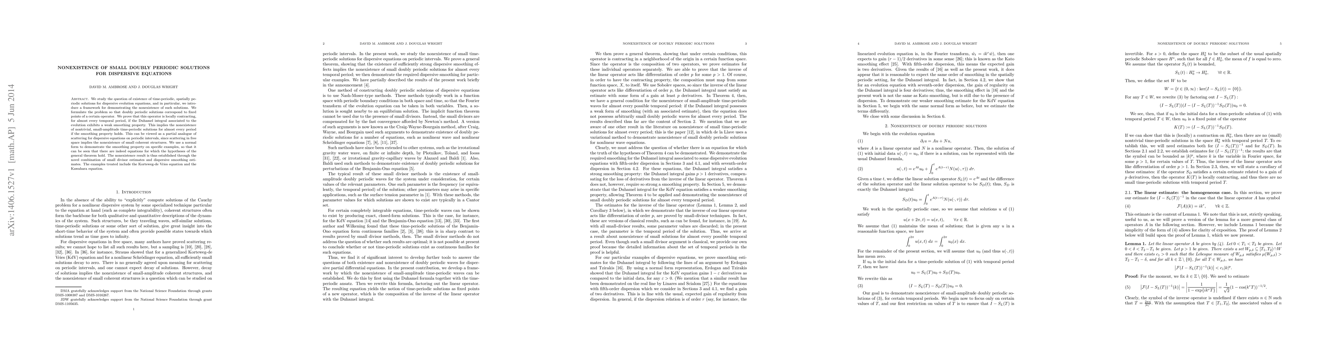 This paper demonstrates the nonexistence of small doubly periodic solutions for certain dispersive evolution equations by proving that a specific operator is locally contracting under a weak smoothing property. The result is established through a combination of small divisor estimates and dispersive smoothing estimates, with applications to the Korteweg-de Vries and Kawahara equations.