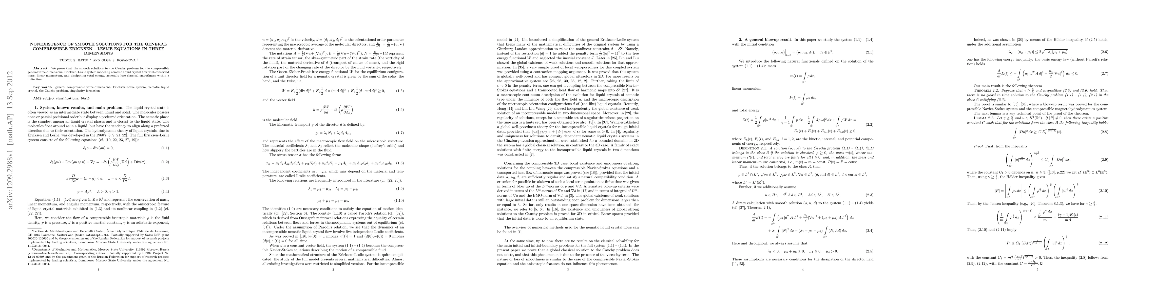 Summary: This paper demonstrates that smooth solutions to the three-dimensional Ericksen-Leslie equations for compressible nematic liquid crystal flow typically lose their classical smoothness within a finite time. The study focuses on the conservation of mass, linear momentum, and dissipating total energy.