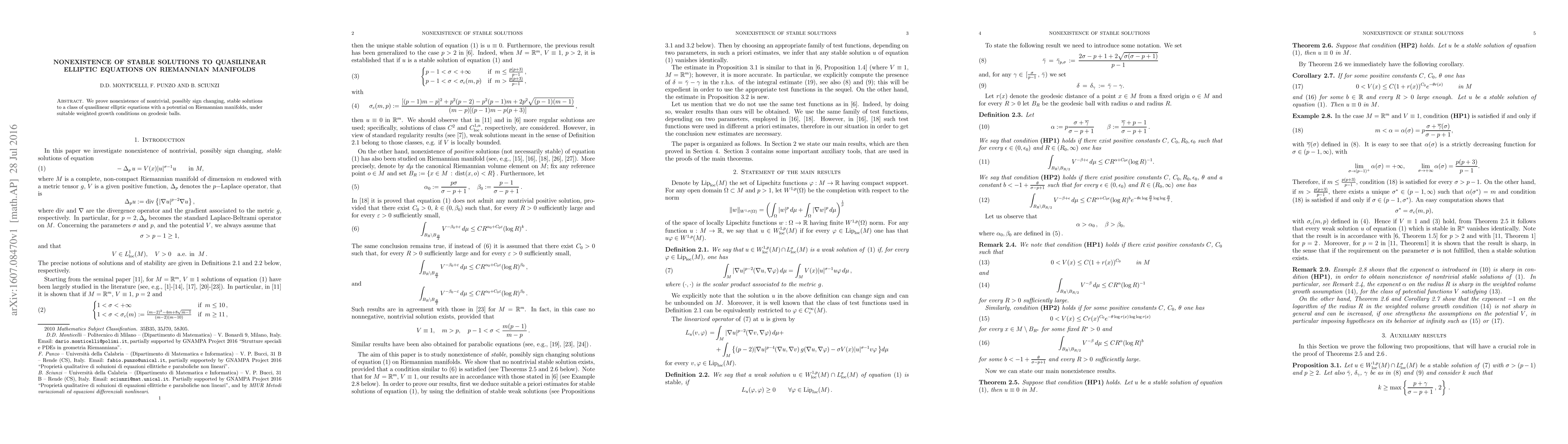This paper demonstrates that stable solutions to quasilinear elliptic equations on Riemannian manifolds do not exist, even for sign-changing functions, under specific volume growth conditions. These findings apply to a broad class of such equations with potential terms.