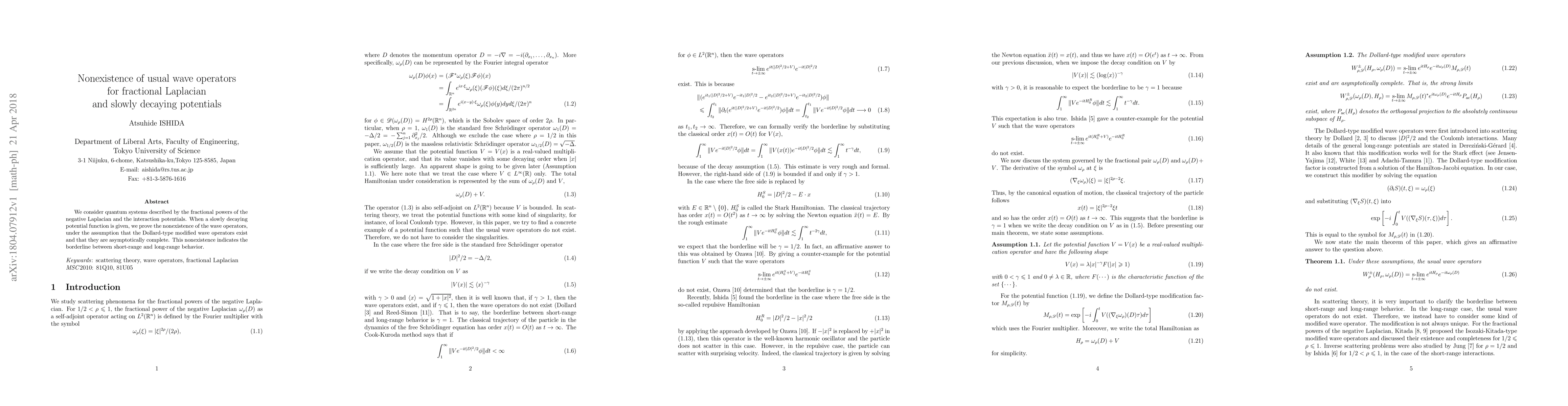 We consider quantum systems described by the fractional powers of the negative Laplacian and the interaction potentials. When a slowly decaying potential function is given, we prove the nonexistence of the wave operators, under the assumption that the Dollard-type modified wave operators exist and that they are asymptotically complete. This nonexistence indicates the borderline between short-range and long-range behavior.