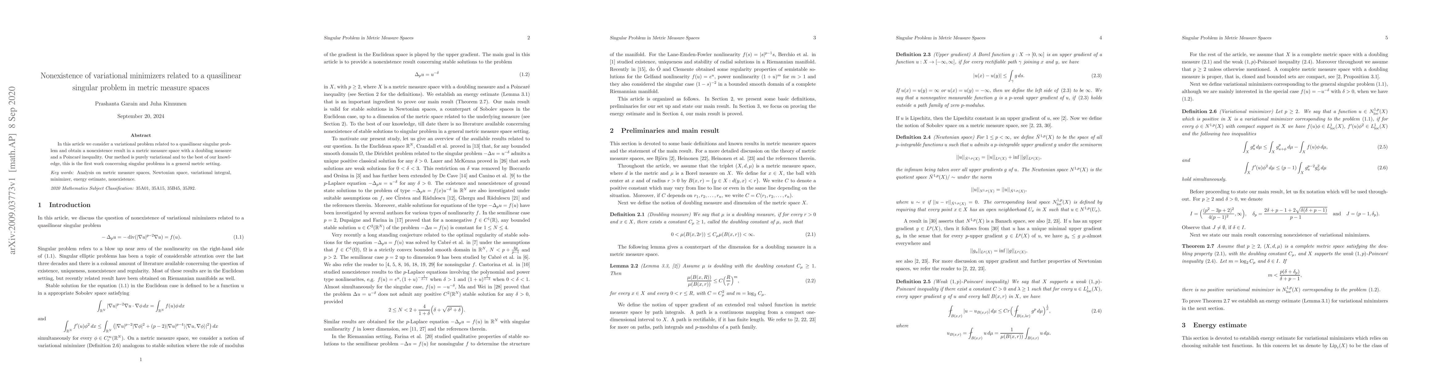 In this article we consider a variational problem related to a quasilinear singular problem and obtain a nonexistence result in a metric measure space with a doubling measure and a Poincar\'e inequality. Our method is purely variational and to the best of our knowledge, this is the first work concerning singular problems in a general metric setting.