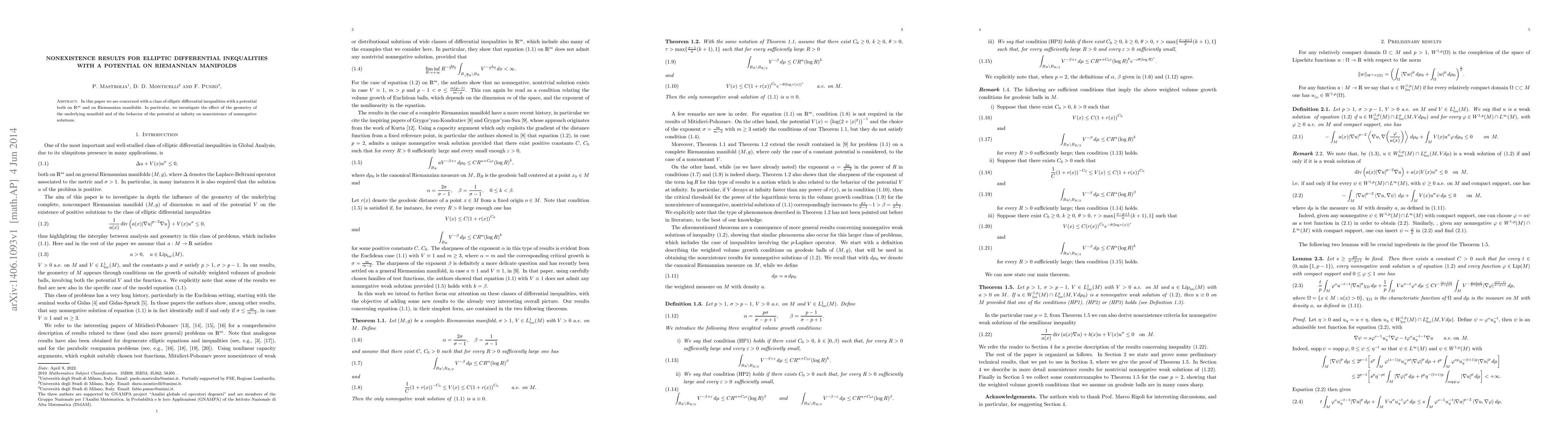 Summary: This paper explores elliptic differential inequalities with potentials on both Euclidean and Riemannian manifolds, focusing on how the manifold's geometry and potential behavior influence the nonexistence of nonnegative solutions.