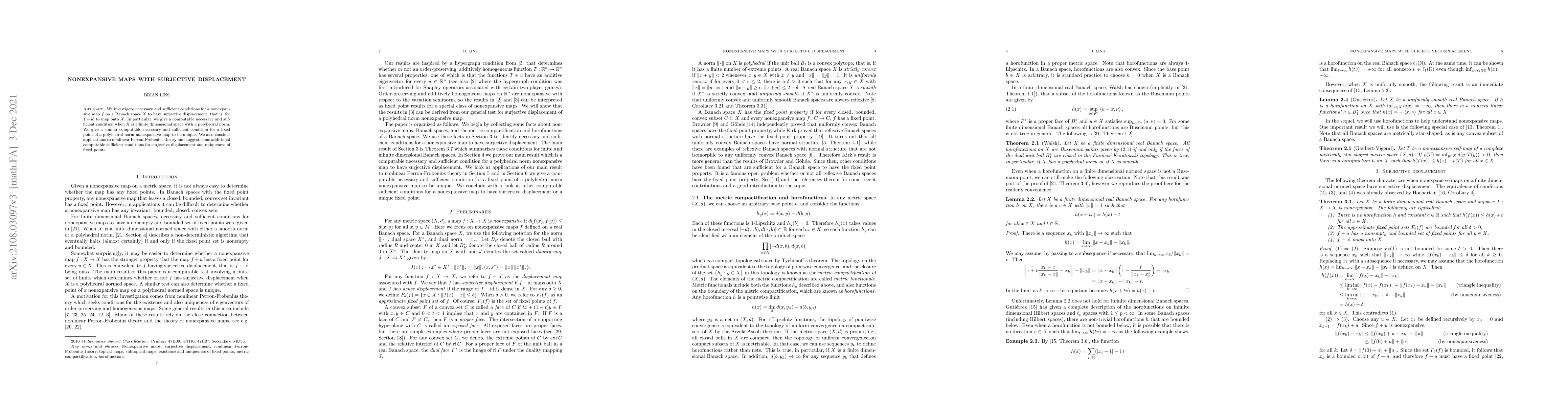 We investigate necessary and sufficient conditions for a nonexpansive map $f$ on a Banach space $X$ to have surjective displacement, that is, for $f - \mathrm{id}$ to map onto $X$. In particular, we give a computable necessary and sufficient condition when $X$ is a finite dimensional space with a polyhedral norm. We give a similar computable necessary and sufficient condition for a fixed point of a polyhedral norm nonexpansive map to be unique. We also consider applications to nonlinear Perron-Frobenius theory and suggest some additional computable sufficient conditions for surjective displacement and uniqueness of fixed points.