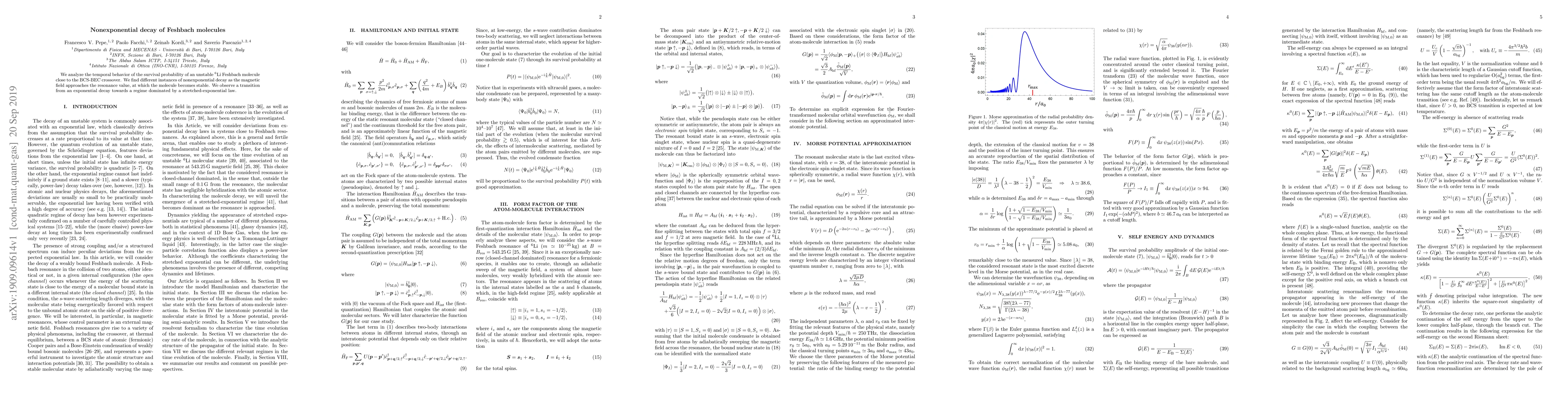 We analyze the temporal behavior of the survival probability of an unstable $^6$Li Feshbach molecule close to the BCS-BEC crossover. We find different instances of nonexponential decay as the magnetic field approaches the resonance value, at which the molecule becomes stable. We observe a transition from an exponential decay towards a regime dominated by a stretched-exponential law.