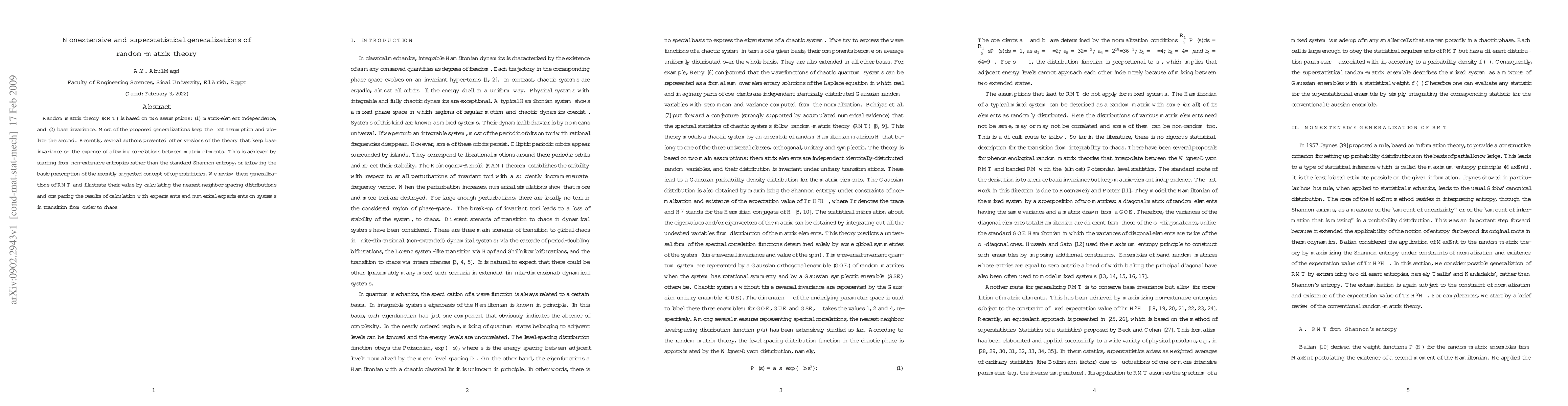 Random matrix theory (RMT) is based on two assumptions: (1) matrix-element independence, and (2) base invariance. Most of the proposed generalizations keep the first assumption and violate the second. Recently, several authors presented other versions of the theory that keep base invariance on the expense of allowing correlations between matrix elements. This is achieved by starting from non-extensive entropies rather than the standard Shannon entropy, or following the basic prescription of the recently suggested concept of superstatistics. We review these generalizations of RMT and illustrate their value by calculating the nearest-neighbor-spacing distributions and comparing the results of calculation with experiments and numerical-experiments on systems in transition from order to chaos.