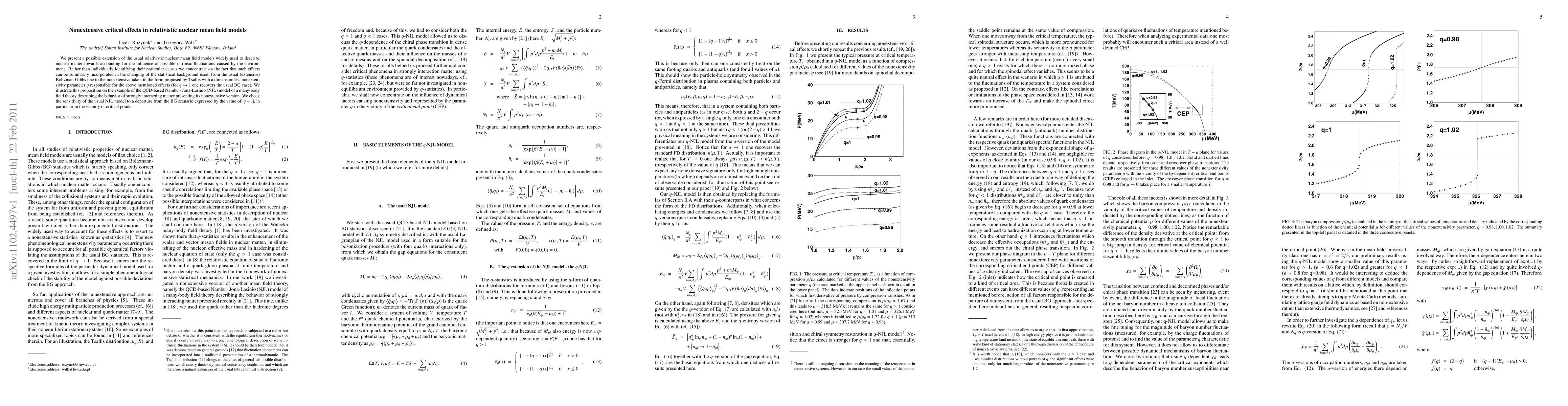 This paper extends relativistic nuclear mean field models to incorporate nonextensive statistical effects, using Tsallis statistics with a nonextensivity parameter $q$. The study applies this approach to the QCD-based NJL model, examining its sensitivity near critical points and demonstrating the effects of deviations from the standard Boltzmann-Gibbs scenario.