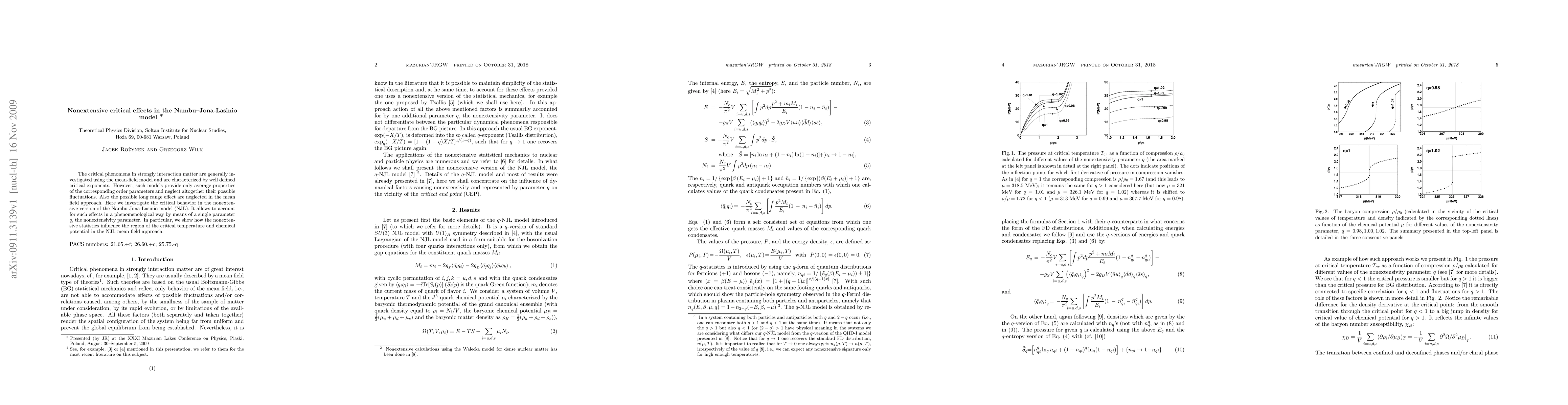 The critical phenomena in strongly interaction matter are generally investigated using the mean-field model and are characterized by well defined critical exponents. However, such models provide only average properties of the corresponding order parameters and neglect altogether their possible fluctuations. Also the possible long range effect are neglected in the mean field approach. Here we investigate the critical behavior in the nonextensive version of the Nambu Jona-Lasinio model (NJL). It allows to account for such effects in a phenomenological way by means of a single parameter $q$, the nonextensivity parameter. In particular, we show how the nonextensive statistics influence the region of the critical temperature and chemical potential in the NJL mean field approach.