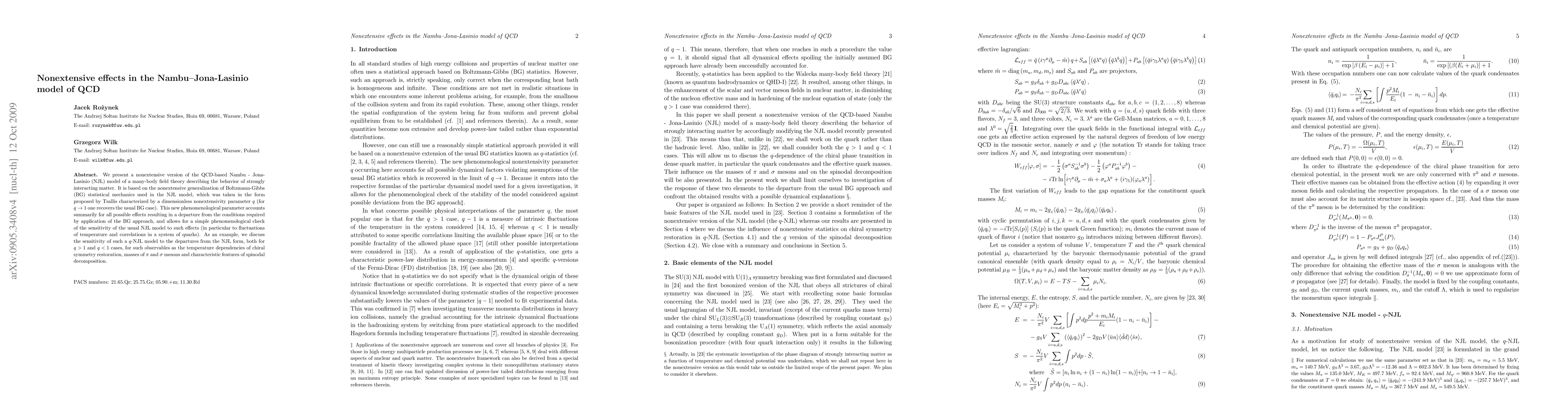 We present a nonextensive version of the recently discussed QCD-based Nambu - Jona-Lasinio (NJL) model of many-body field theory describing behavior of strongly interacting matter. It is based on the nonextensive generalization of the Boltzmann-Gibbs (BG) statistical mechanics used in NJL model, which was taken in the form proposed by Tsallis and characterized by a dimensionless nonextensivity parameter q (for q -> 1 one recovers the usual BG case). This is a new phenomenological parameter of the model which accounts summarily for all possible (so far unspecified) effects leading to departure from the conditions required by the usual BG approach to be fully applicable. It turns out that temperature dependencies of chiral symmetry restoration, masses of pion and sigma meson and characteristic features of spinodal decomposition are sensitive to the departures from the usual BG case.