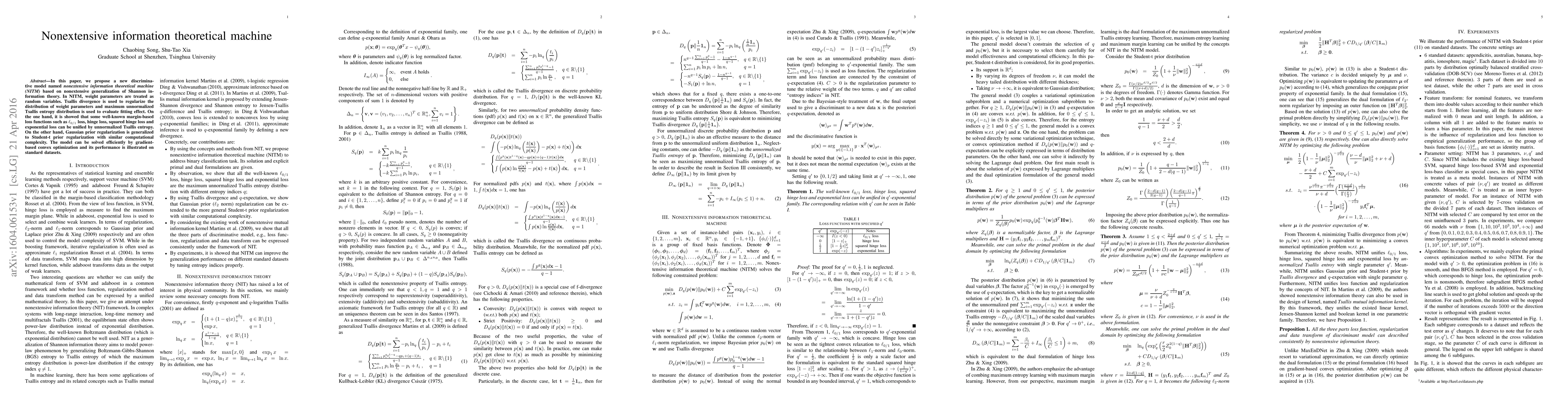 This paper introduces the nonextensive information theoretical machine (NITM), a discriminative model based on nonextensive Shannon information theory. It uses Tsallis divergence for regularization and unnormalized Tsallis entropy for evaluation, unifying various margin-based loss functions and generalizing Gaussian prior to Student-t prior regularization. The model is efficiently solved via gradient-based convex optimization and demonstrates performance on standard datasets.