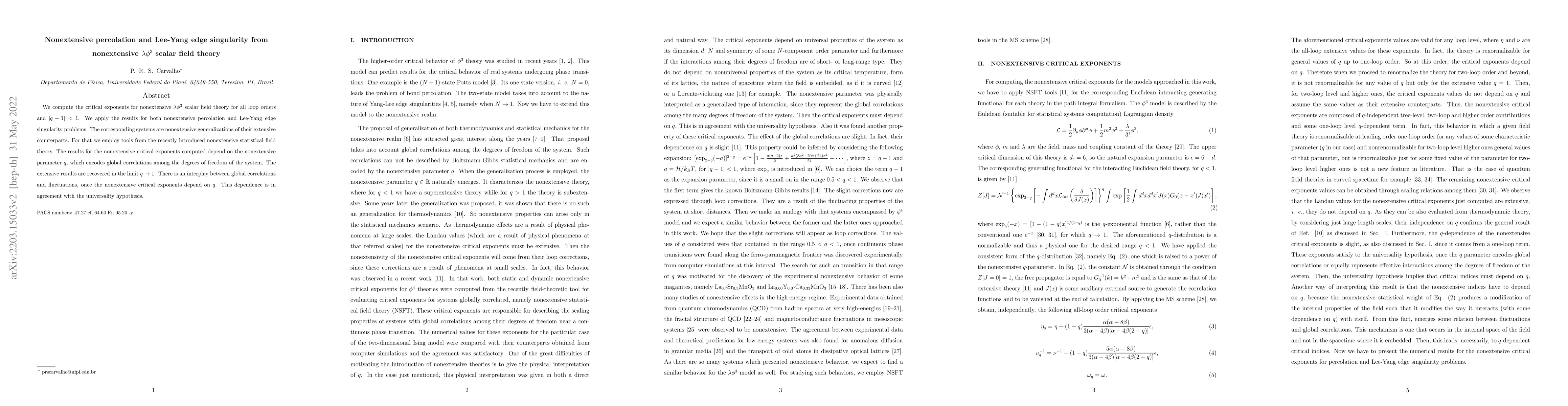 We compute the critical exponents for nonextensive $\lambda\phi^{3}$ scalar field theory for all loop orders and $|q - 1| < 1$. We apply the results for both nonextensive percolation and Lee-Yang edge singularity problems. The corresponding systems are nonextensive generalizations of their extensive counterparts. For that we employ tools from the recently introduced nonextensive statistical field theory. The results for the nonextensive critical exponents computed depend on the nonextensive parameter $q$, which encodes global correlations among the degrees of freedom of the system. The extensive results are recovered in the limit $q\rightarrow 1$. There is an interplay between global correlations and fluctuations, once the nonextensive critical exponents depend on $q$. This dependence is in agreement with the universality hypothesis.