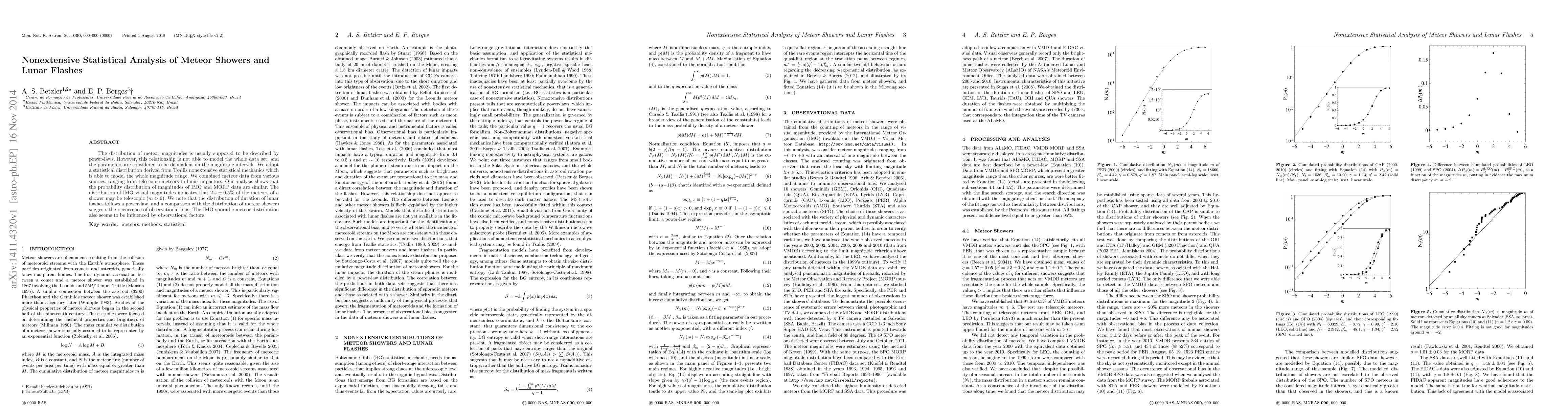 The distribution of meteor magnitudes is usually supposed to be described by power-laws. However, this relationship is not able to model the whole data set, and the parameters are considered to be dependent on the magnitude intervals. We adopt a statistical distribution derived from Tsallis nonextensive statistical mechanics which is able to model the whole magnitude range. We combined meteor data from various sources, ranging from telescopic meteors to lunar impactors. Our analysis shows that the probability distribution of magnitudes of IMO and MORP data are similar. The distribution of IMO visual magnitudes indicates that $2.4\pm0.5%$ of the meteors of a shower may be telescopic ($m> 6$). We note that the distribution of duration of lunar flashes follows a power-law, and a comparison with the distribution of meteor showers suggests the occurrence of observational bias. The IMO sporadic meteor distribution also seems to be influenced by observational factors.