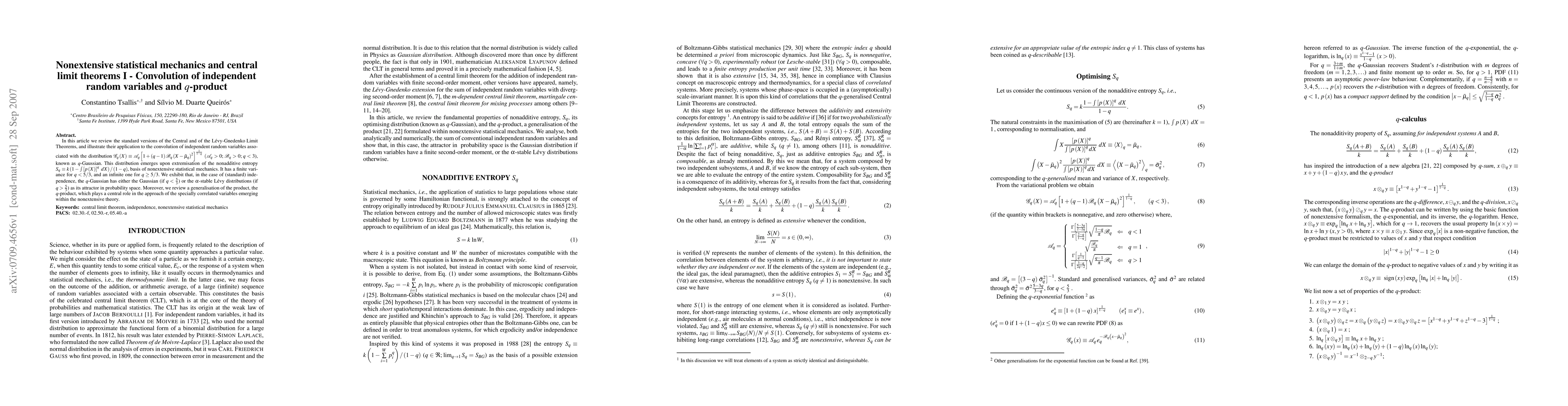This paper reviews the Central and Levy-Gnedenko Limit Theorems applied to the convolution of independent random variables with q-Gaussian distribution, a key component of nonextensive statistical mechanics. It shows that the q-Gaussian converges to Gaussian or a-stable Levy distributions depending on the value of q, and introduces the q-product as a generalization crucial for correlated variables in nonextensive theory.