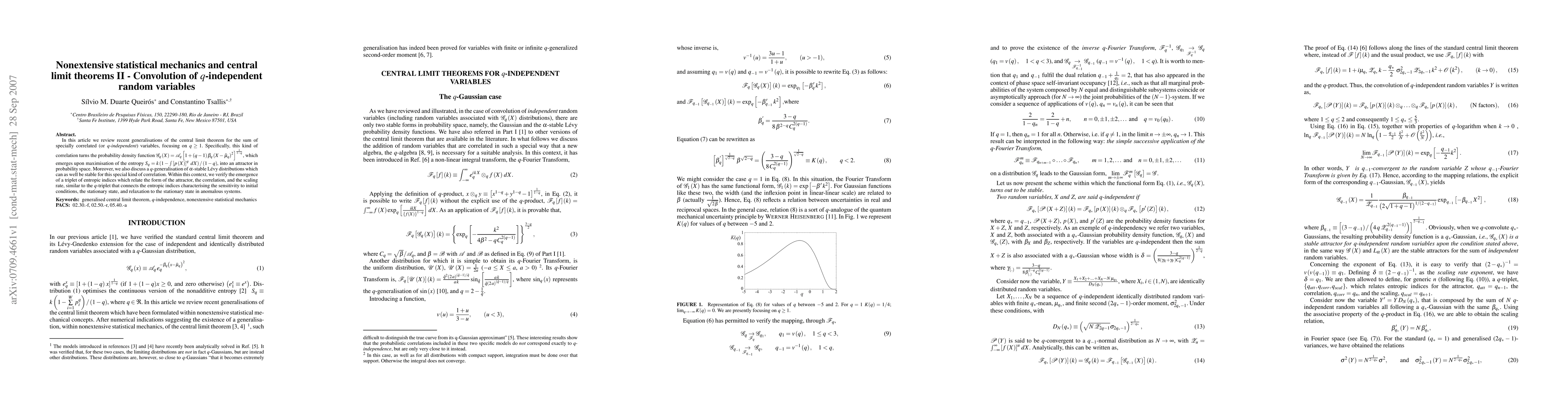 This paper reviews extensions of the central limit theorem for specially correlated variables, or q-independent ones, with q >= 1. It highlights the q-Gaussian's role as an attractor in probability space and explores a q-generalisation of a-stable Levy distributions. The research identifies a triplet of entropic indices linking the attractor's form, correlation, and scaling rate, akin to the q-triplet in anomalous systems.