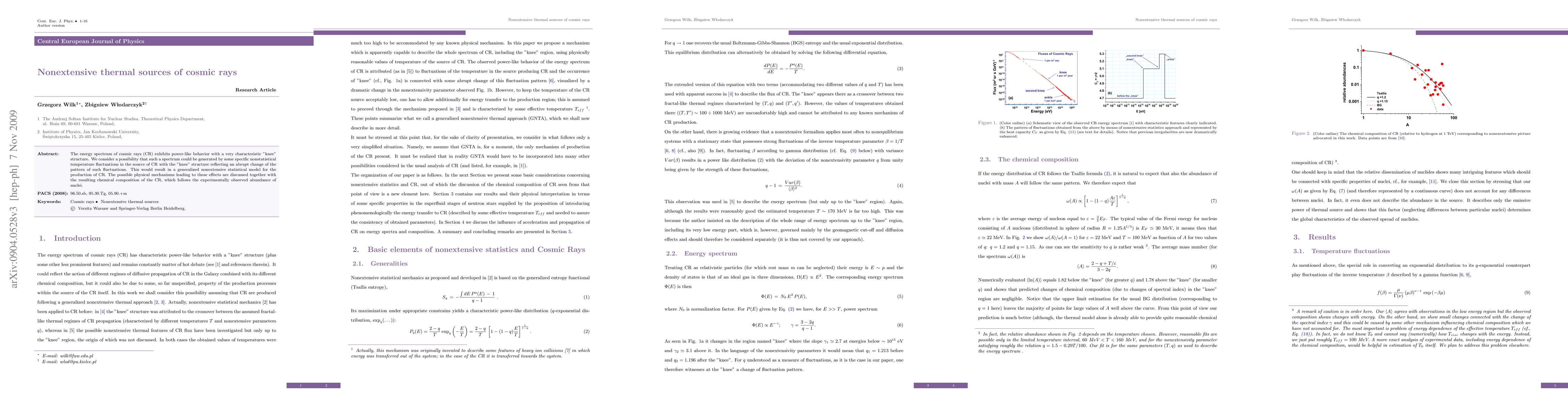 The energy spectrum of cosmic rays (CR) exhibits power-like behavior with a very characteristic "knee" structure. We consider a possibility that such a spectrum could be generated by some specific nonstatistical temperature fluctuations in the source of CR with the "knee" structure reflecting an abrupt change of the pattern of such fluctuations. This would result in a generalized nonextensive statistical model for the production of CR. The possible physical mechanisms leading to these effects are discussed together with the resulting chemical composition of the CR, which follows the experimentally observed abundance of nuclei.