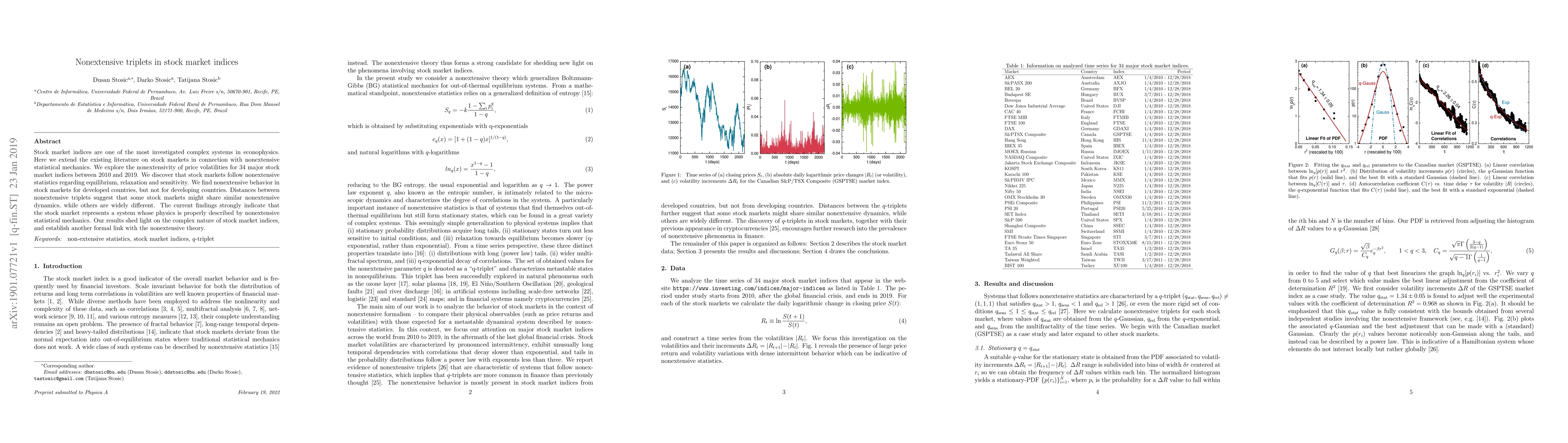 Stock market indices are one of the most investigated complex systems in econophysics. Here we extend the existing literature on stock markets in connection with nonextensive statistical mechanics. We explore the nonextensivity of price volatilities for 34 major stock market indices between 2010 and 2019. We discover that stock markets follow nonextensive statistics regarding equilibrium, relaxation and sensitivity. We find nonextensive behavior in stock markets for developed countries, but not for developing countries. Distances between nonextensive triplets suggest that some stock markets might share similar nonextensive dynamics, while others are widely different. The current findings strongly indicate that the stock market represents a system whose physics is properly described by nonextensive statistical mechanics. Our results shed light on the complex nature of stock market indices, and establish another formal link with the nonextensive theory.