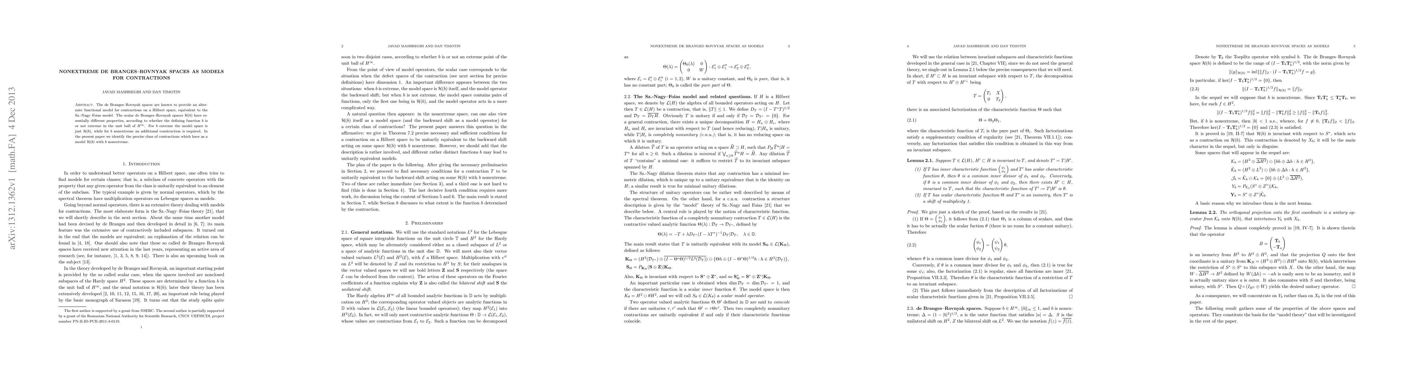 The de Branges--Rovnyak spaces are known to provide an alternate functional model for contractions on a Hilbert space, equivalent to the Sz.-Nagy--Foias model. The scalar de Branges--Rovnyak spaces $\mathcal{H}(b)$ have essentially different properties, according to whether the defining function $b$ is or not extreme in the unit ball of $H^\infty$. For $b$ extreme the model space is just $\mathcal{H}(b)$, while for $b$ nonextreme an additional construction is required. In the present paper we identify the precise class of contractions which have as a model $\mathcal{H}(b)$ with $b$ nonextreme.