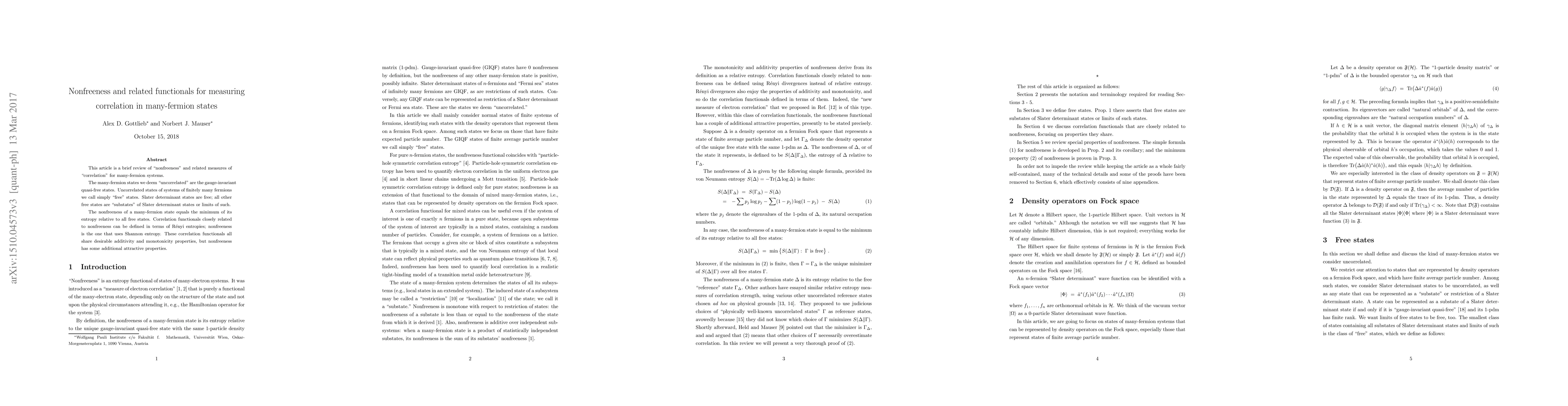 This article is a brief review of "nonfreeness" and related measures of "correlation" for many-fermion systems. The many-fermion states we deem "uncorrelated" are the gauge-invariant quasi-free states. Uncorrelated states of systems of finitely many fermions we call simply "free" states. Slater determinant states are free; all other free states are "substates" of Slater determinant states or limits of such. The nonfreeness of a many-fermion state equals the minimum of its entropy relative to all free states. Correlation functionals closely related to nonfreeness can be defined in terms of R\'enyi entropies; nonfreeness is the one that uses Shannon entropy. These correlation functionals all share desirable additivity and monotonicity properties, but nonfreeness has some additional attractive properties.