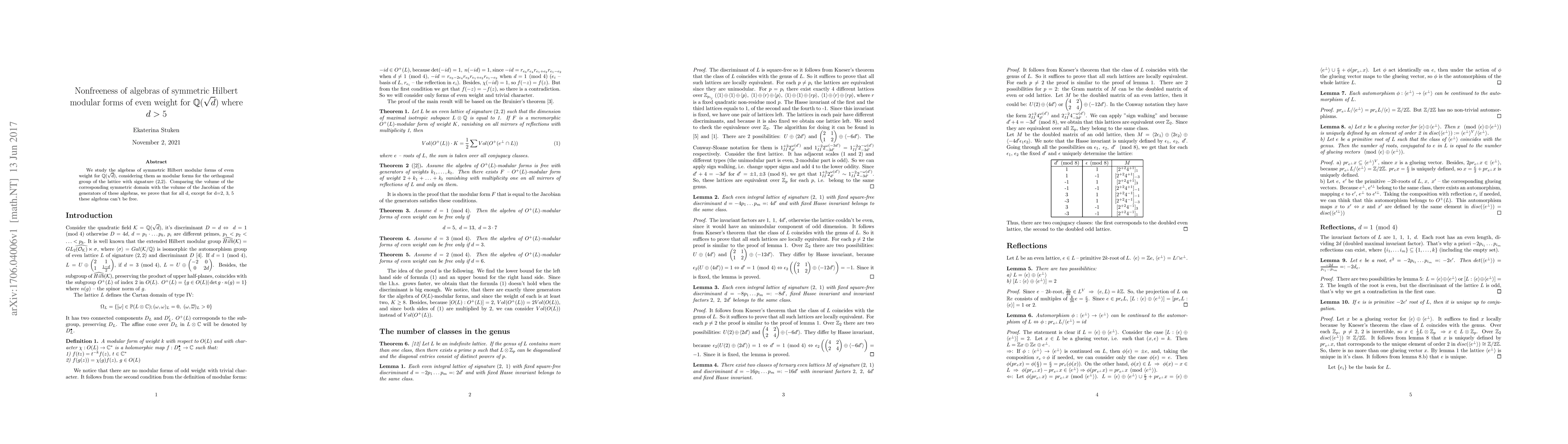 Researchers prove that algebras of symmetric Hilbert modular forms for even weight lattices with d > 5 cannot be free, except for specific exceptions d = 2, 3, 5.