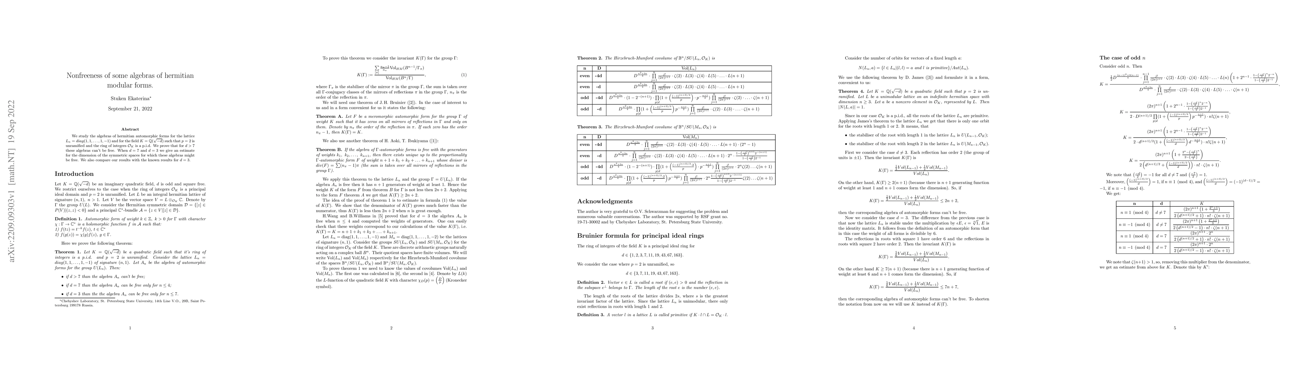 This paper investigates the nonfreeness of algebras of hermitian modular forms for specific lattices and quadratic fields. It proves that for $d > 7$, these algebras cannot be free, while providing dimension estimates for $d=7$ and $d=3$ to determine potential freeness.