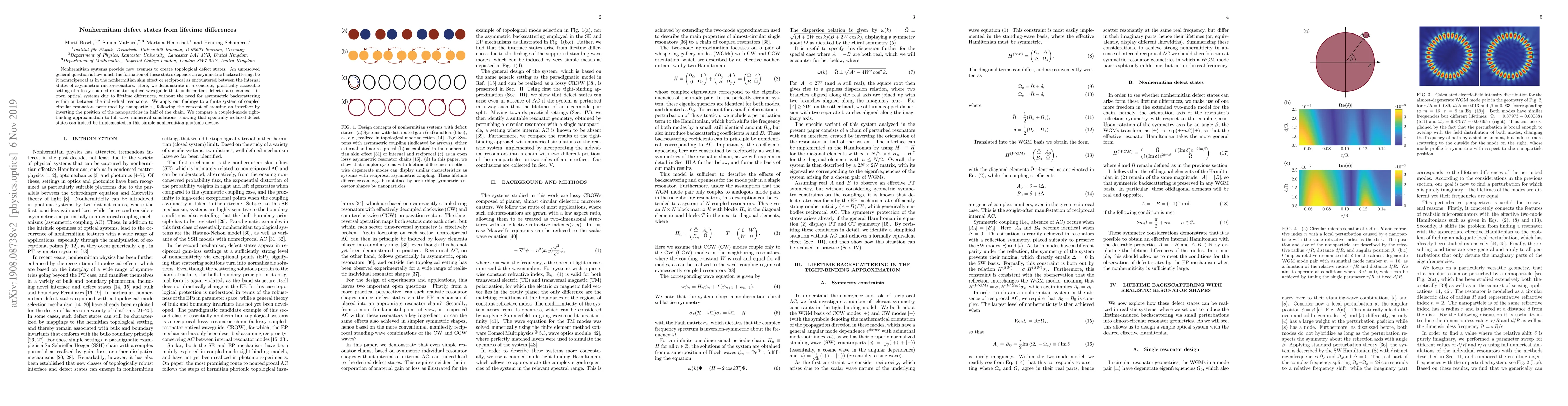 This paper demonstrates that nonhermitian defect states can emerge in optical waveguides due to differences in resonator lifetimes, without requiring asymmetric backscattering. The study applies this concept to a photonic device with coupled resonators perturbed by nanoparticles, showing spectrally isolated defect states through both theoretical and numerical simulations.